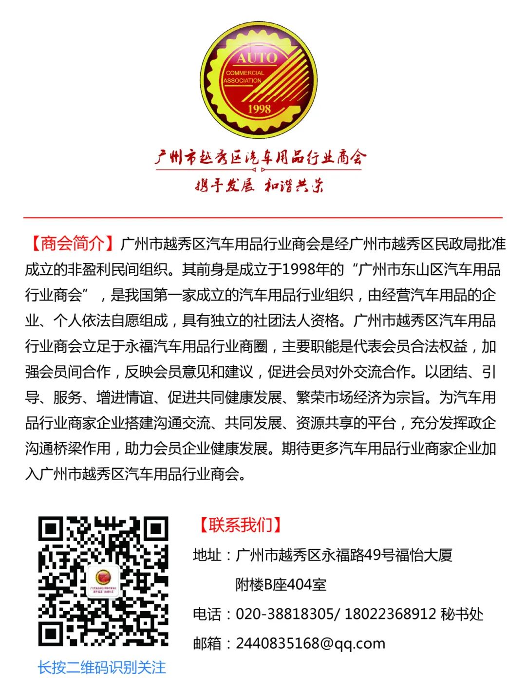致力于加强对外经贸交流合作,引导会员“走出去”求发展,让企业“动起来”“活起来”,为企业发展拓展空间、攒足后劲,真正把商会办成企业家合作共赢的平台。我们期待和诚挚邀请更多的汽车用品商家加入广州市越秀区汽车用品行业商会大家庭,共同携手发展。