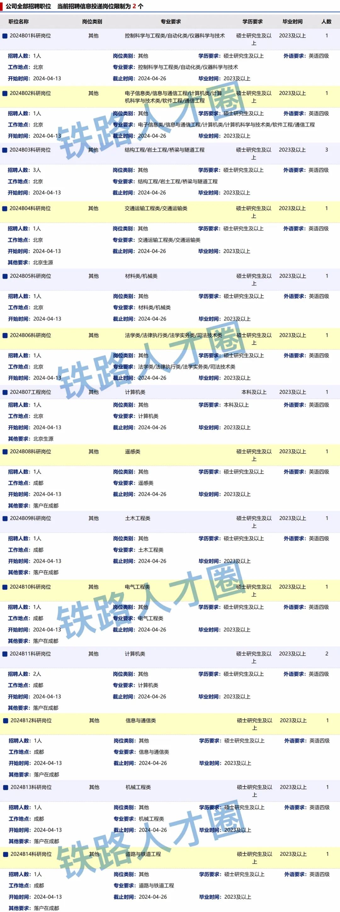 4、17人!中国铁道科学研究院集团有限公司2024年招聘高校毕业生公告(二)(4.26)