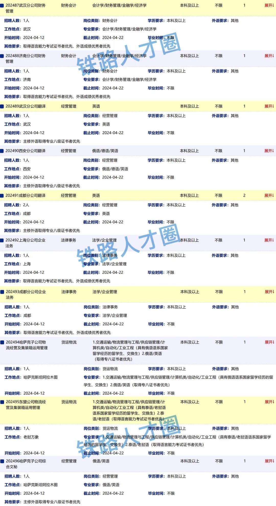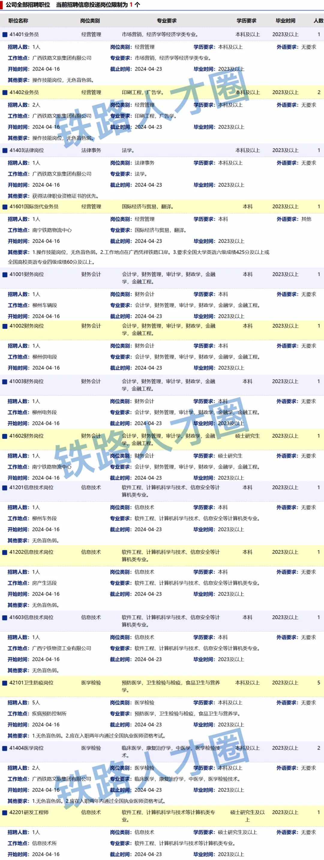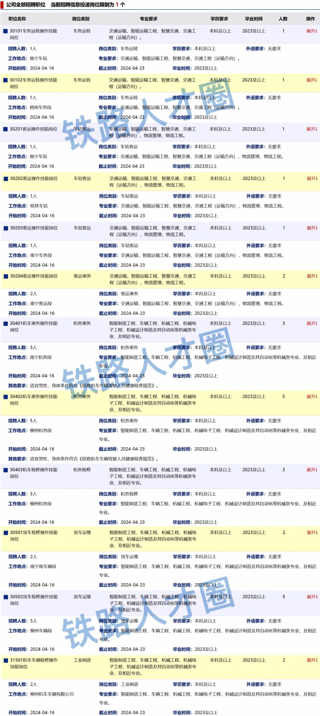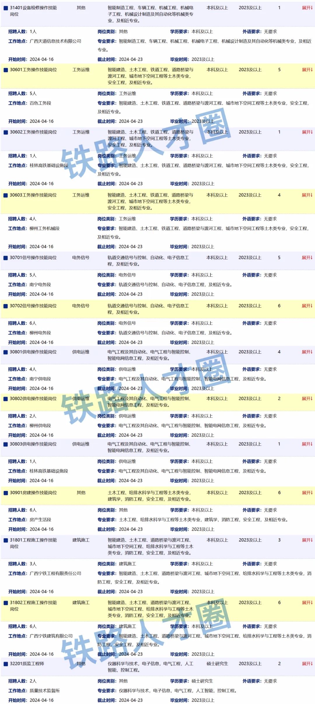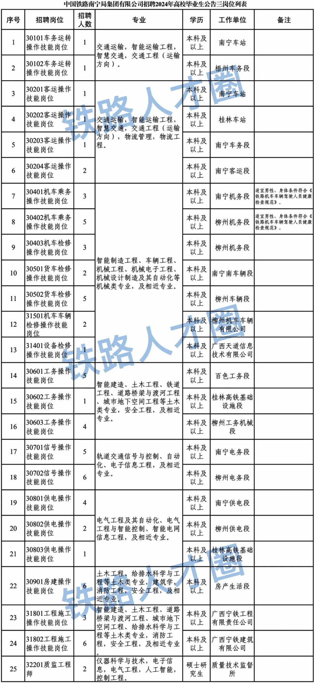 3、20人!中国铁路南宁局集团有限公司招聘2024年高校毕业生公告四(本科及以上学历)(4.23)