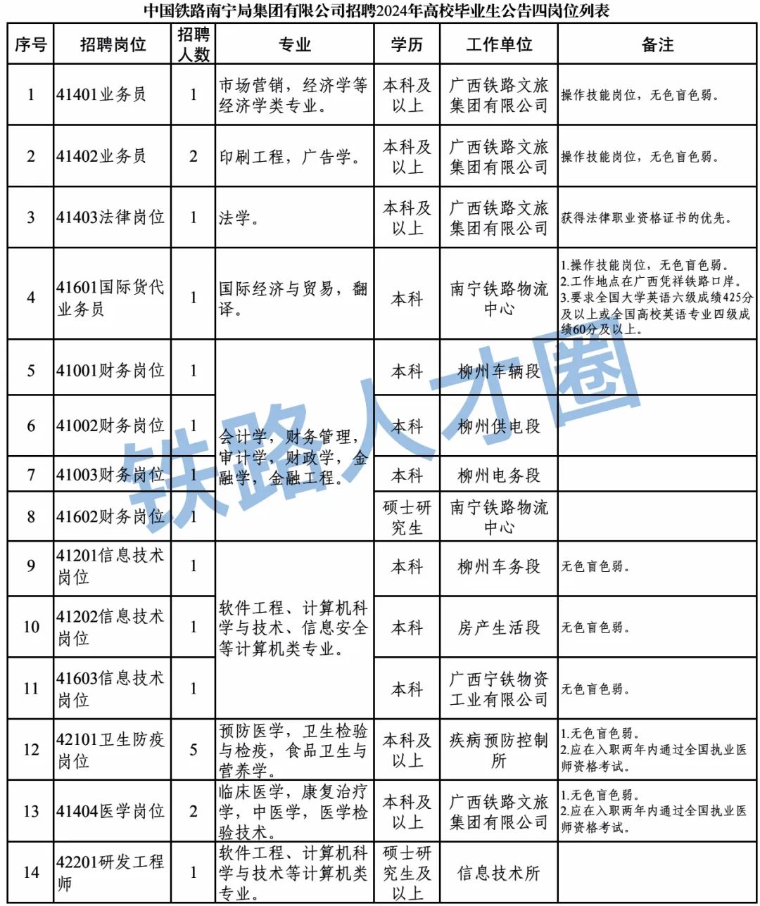 本次招聘岗位、专业、人数详见附件《中国铁路南宁局集团有限公司招聘2024年高校毕业生公告四岗位列表》。