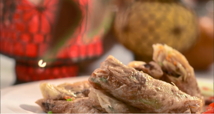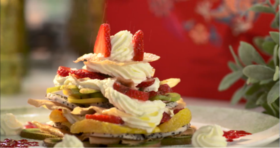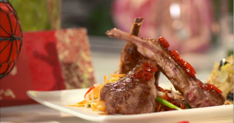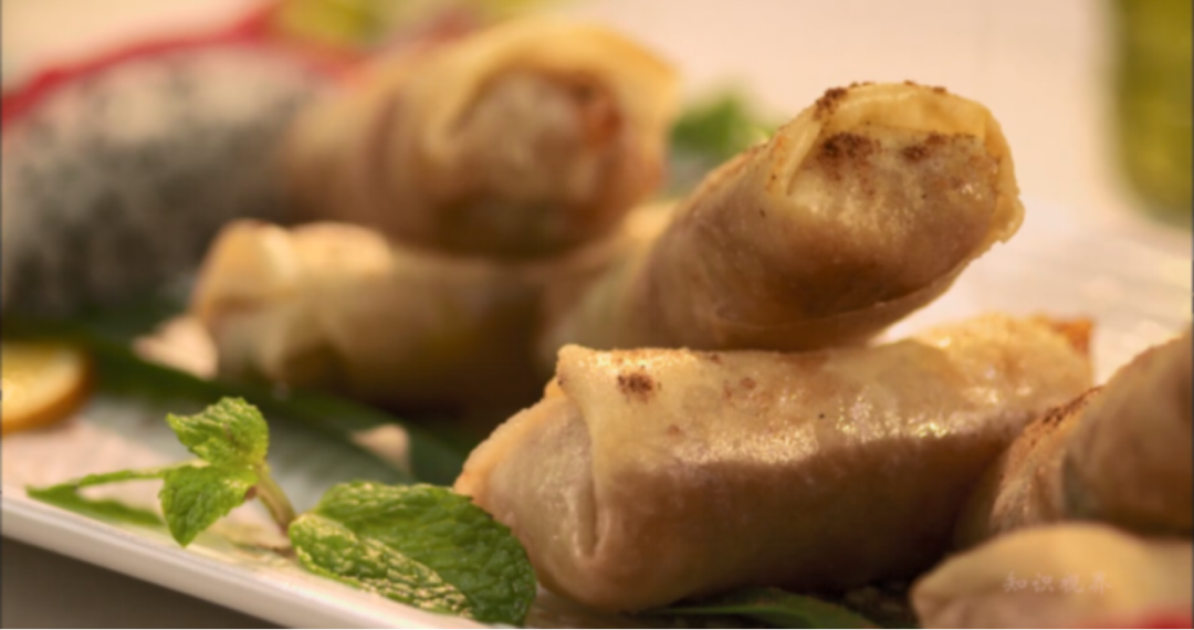 香脆腐皮卷、三椒烤羊排、水果蛋糕
