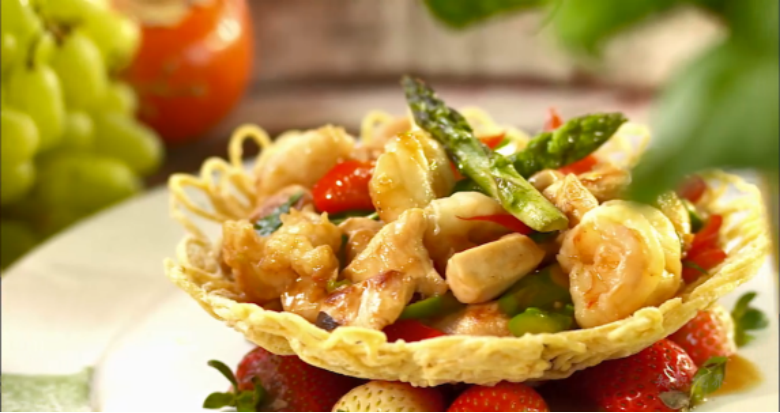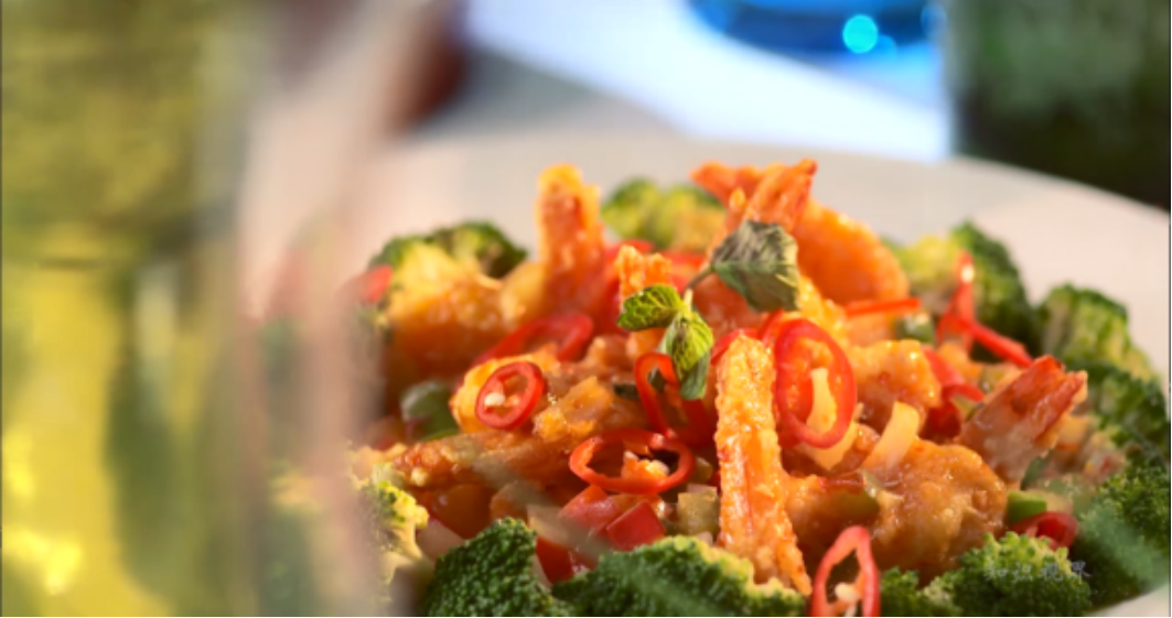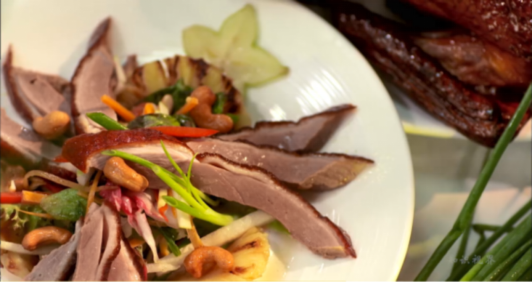 北京甜酸虾、沙拉烤鸭、红酒雪梨
