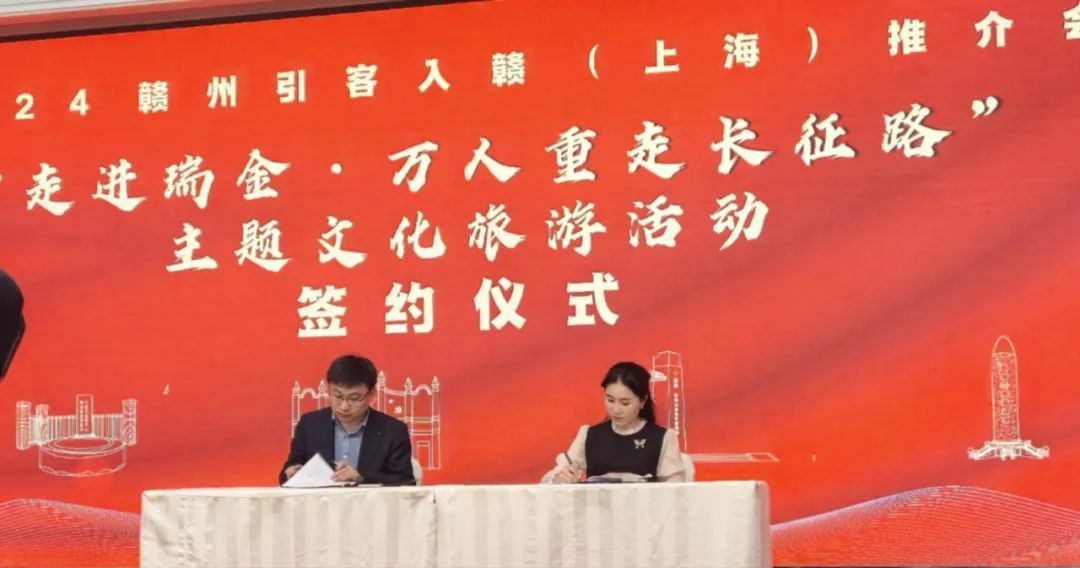 洽谈会上瑞金市文广新旅局和上海途禾旅游发展有限公司签订《纪念中央红军长征出发九十周年——"走进瑞金·万人重走长征路"主题文化旅游活动合作协议》。