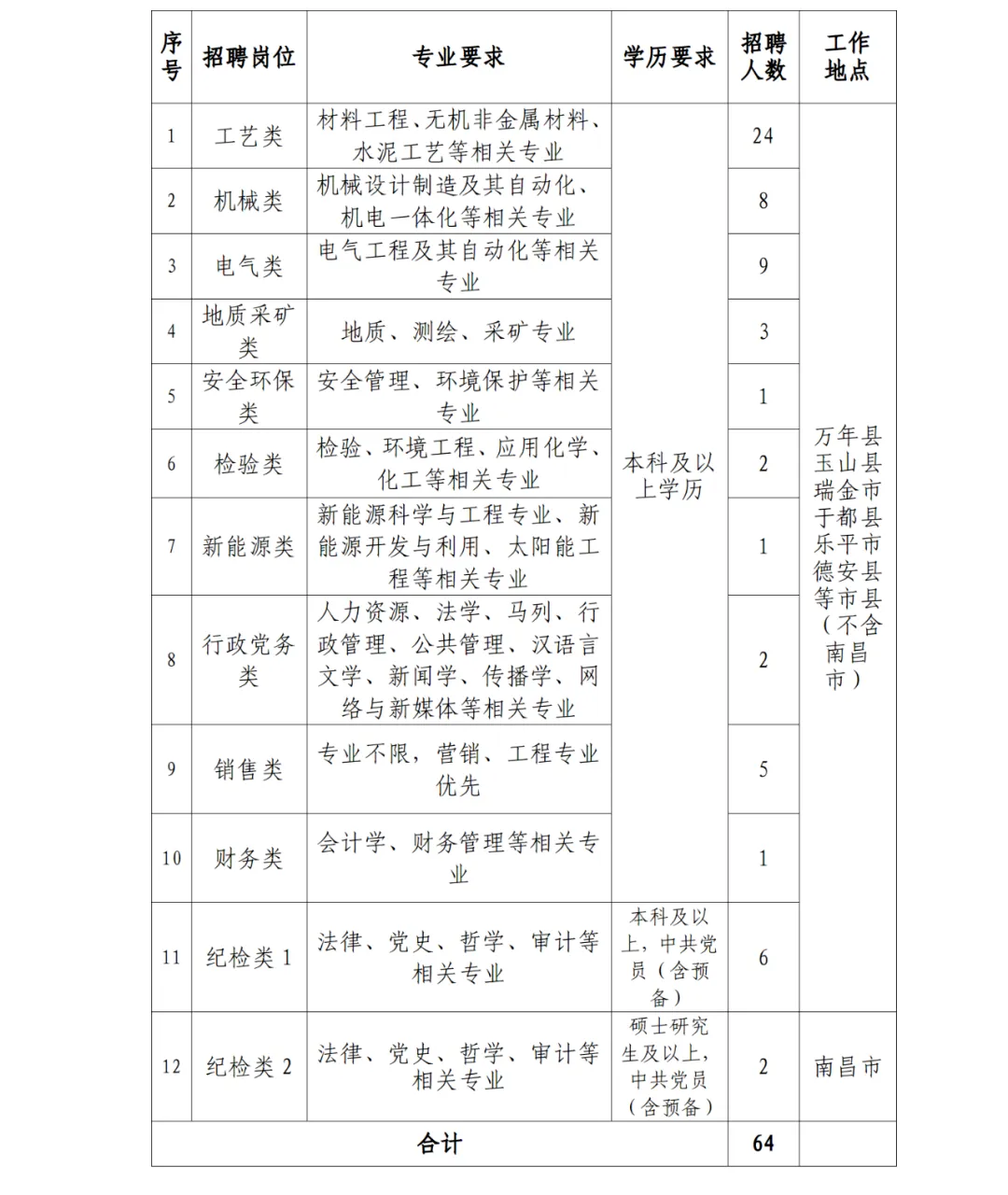 为满足公司的生产经营需求,面向社会公开招聘,本次招聘岗位类别12个,招聘人数共计64人,人员分配到江西省内下属各生产基地。