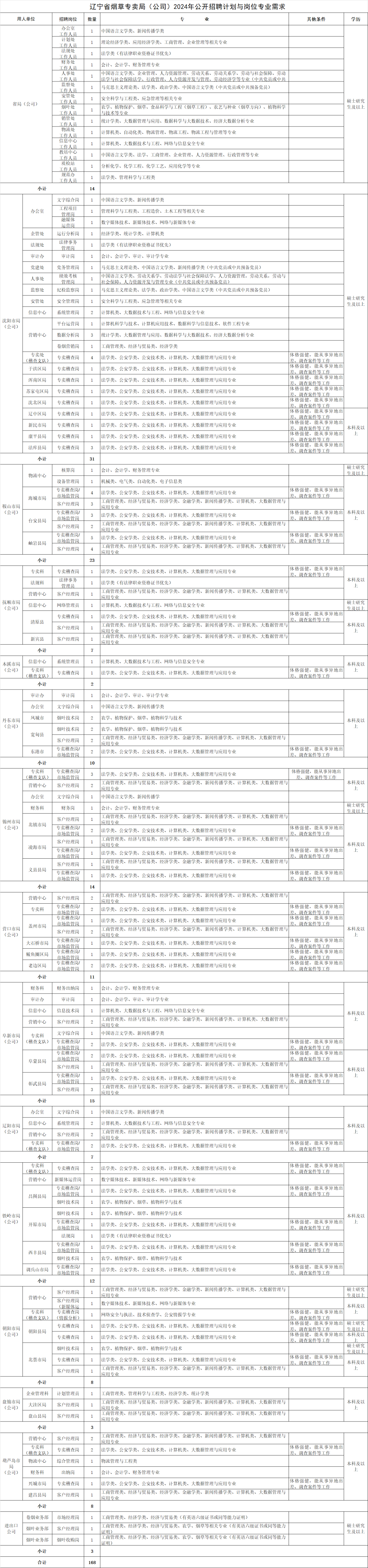 本次招聘岗位计划、专业及资格要求,具体详见《中国烟草总公司辽宁省公司2024年人员招聘岗位计划与资格条件》