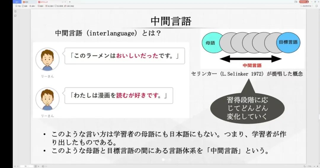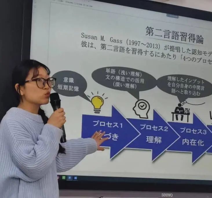 首先,我注意到二语习得论在日语教学中的实际应用价值。杨丹萍学姐详细讲解了二语习得理论的发展阶段和特征,让我对二语习得有了更为深入的了解。同时,对于我提出的作为教师应该如何运用二语习得理论避免学生在日语学习中可能会出现的石化和回避等问题,杨丹萍学姐认为应该深入理解并分析学生出现的错误并分析其产生的原因,以便更好地对症下药纠正学生在二语习得中的错误。同时,这也让我认识到,面对问题,应该先分析其产生的原因,这样才能更好地解决问题。