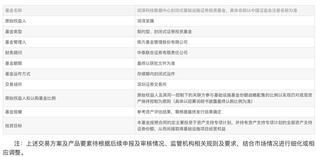 润泽智算科技集团股份有限公司关于全资子公司润泽科技发展有限公司开展公募REITs申报发行工作的公告根据《关于推进基础设施领域不动产投资信托基金(REITs)试点相关工作的通知》《公开募集基础设施证券投资基金指引(试行)》《关于进一步盘活存量资产扩大有效投资的意见》《关于进一步做好基础设施领域不动产投资信托基金(REITs)试点工作的通知》和《关于规范做好基础设施领域不动产投资信托基金(REITs)项目申报推荐工作的通知》等文件要求,为支持润泽智算科技集团股份有限公司(简称“公司”)及下属全资子公司润泽科技发展有限公司(简称“润泽发展”)的经营发展,公司于2024年4月16日召开第四届董事会第十九次会议、第四届监事会第十五次会议,审议通过了《关于全资子公司润泽科技发展有限公司开展公募REITs申报发行工作的议案》,同意公司的全资子公司润泽发展以国际信息云聚核港(ICFZ)项目-数据中心A18建设项目(简称“A-18数据中心”)及其附属设施设备(合称“基础设施项目”)作为发起设立公开募集基础设施证券投资基金(REITs)(简称“润泽REITs”、“基础设施REITs”或“本项目”)的底层资产,开展基础设施不动产投资信托基金(REITs)试点申报工作(“本次发行”)。本次发行基础设施公募REITs未构成关联交易,未构成《上市公司重大资产重组管理办法》规定的重大资产重组。本事项尚需提交公司股东大会审议,具体召开股东大会时间公司将根据实际安排另行公告通知。润泽发展拟以A-18数据中心及其附属设施设备作为发起设立润泽REITs的底层资产,开展基础设施不动产投资信托基金(REITs)试点申报工作。基础设施项目位于河北省廊坊经济开发区梨园路2号,投产机柜数量5,897个,上架率99.5%,IT总功率超42MW。润泽发展作为原始权益人拟以A-18数据中心及其附属设施设备作为发起设立润泽REITs的底层资产,开展基础设施不动产投资信托基金(REITs)试点申报工作。待本项目获得国家发展和改革委员会(简称“发改委”)向中国证券监督管理委员会(简称“中国证监会”)的推荐后,由公募基金管理人、资产支持专项计划管理人向中国证监会申请注册基础设施公募REITs,并申请在深圳证券交易所上市交易。待取得注册文件后,由公募基金管理人会同财务顾问进行公开发售。润泽发展或其同一控制下的关联方将根据法律法规和监管规则的要求参与润泽REITs的战略配售。润泽发展作为原始权益人,由南方资本管理有限公司(简称“南方资本”)作为资产支持专项计划管理人,发行并设立资产支持专项计划(简称“专项计划”,具体名称以专项计划设立时的名称为准)。润泽REITs将全额认购基础设施支持证券份额。润泽发展作为原始权益人拟将其持有的基础设施项目以适当的方式剥离至专门持有基础设施项目的项目公司,润泽发展持有项目公司100%股权。润泽发展拟设立特殊目的公司(以下简称“SPV”),并将其持有的SPV100%股权转让予专项计划(“SPV股权转让”)。润泽发展与SPV签署《项目公司股权转让协议》,润泽发展将其持有的项目公司股权转让给SPV(“项目公司股权转让”)。通过前述SPV股权转让及项目公司股权转让行为,专项计划届时将直接持有SPV100%股权并在本项目发行后由SPV直接持有项目公司100%股权。完成上述后,项目公司将吸收合并SPV且SPV注销后,专项计划将直接持有项目公司100%股权。润泽发展将作为基础设施项目的运营公司。基础设施公募REITs存续期间,运营公司将作为基础设施项目的运营管理机构提供运营管理服务,并定期收取运营管理费。运营管理安排视最终监管机构要求而定。润泽发展将联合相关专业机构,根据监管机构相关规则及要求不断完善并形成正式申报材料,积极开展基础设施公募REITs向相关省级发改委和国家发改委的申报工作,并积极推动配合专业机构向中国证监会、深圳证券交易所的申报发行工作,推进基础设施公募REITs注册及发行上市工作。最终基础设施公募REITs方案将依据相关监管机构审批确定。本次发行有利于公司盘活优质存量资产,提前收回经营投资及兑现收益,提升资产周转速度;同时拓宽公司的融资渠道,增强公司滚动投资能力,保障公司健康长远可持续发展。本次交易尚需提交股东大会审议。截至目前,本次基础设施REITs仍处于待申报阶段,尚需相关监管机构审核同意,交易条款、时间安排、最终设立方案等尚未最终确定。公司将积极与相关监管机构保持沟通,根据相关政策要求不断完善申报材料等工作,并根据申报进展情况,严格按照法律法规的规定与要求及时履行信息披露义务。