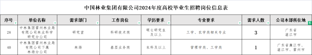招聘单位及岗位信息详见《中国林业集团有限公司2024年度高校应届毕业生招聘岗位信息表》(附件)。