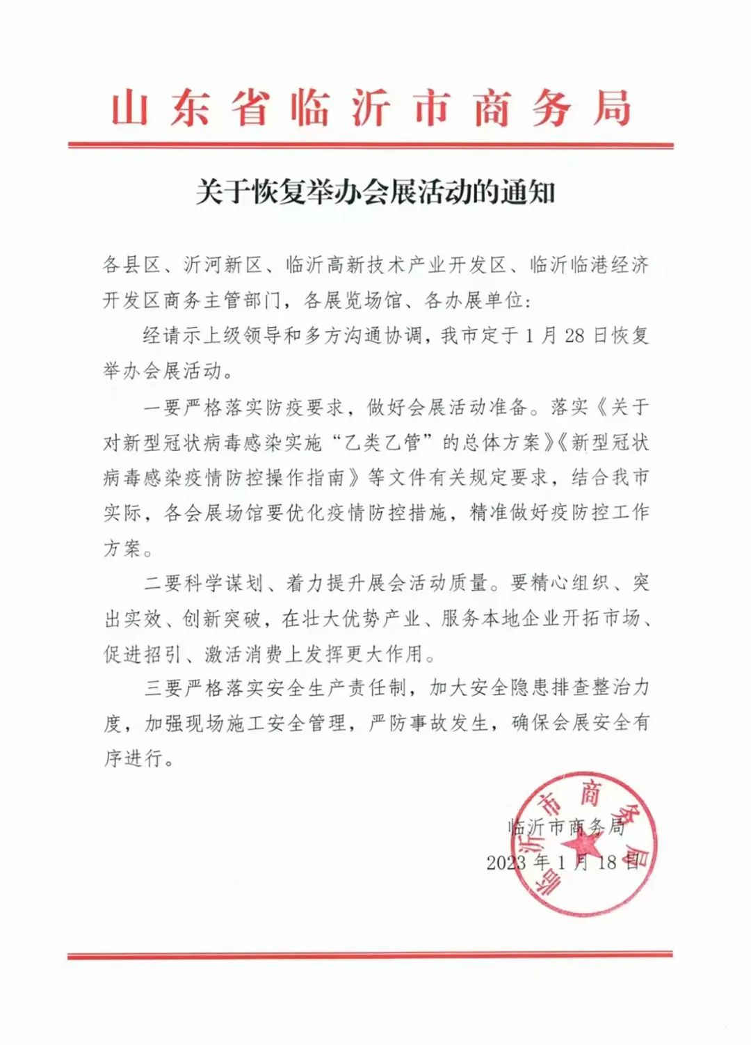 各县区、沂河新区、临沂高新技术产业开发区、临沂临港经济开发区商务主管部门,各展览场馆、各办展单位:经请示上级领导和多方沟通协调,我市定于1月28日恢复举办会展活动。一要严格落实防疫要求,做好会展活动准备。落实《关于对新型冠状病毒感染实施“乙类乙管”的总体方案》《新型冠状病毒感染疫情防控操作指南》等文件有关规定要求,结合我市实际,各会展场馆要优化疫情防控措施,精准做好疫防控工作方案。二要科学谋划、着力提升展会活动质量。要精心组织、突出实效、创新突破,在壮大优势产业、服务本地企业开拓市场、促进招引、激活消费上发挥更大作用。三要严格落实安全生产责任制,加大安全隐患排查整治力度,加强现场施工安全管理,严防事故发生,确保会展安全有序进行。