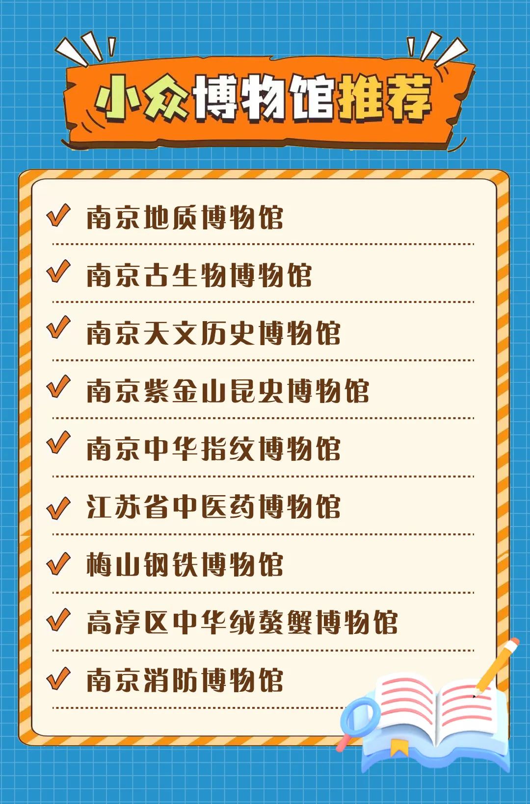 来源:博物南京、南京地质博物馆、江苏省地质调查研究院、南京古生物博物馆、中国科学院紫金山天文台、南京紫金山昆虫博物馆、南京发布、江苏警官学院、梅钢工业文化旅游区、南京文旅、江苏省农业农村厅、高淳文体旅、南京消防等,文章及插图版权属于原作者。如果分享内容侵犯您的版权或者所标来源非第一原创,请联系小编微信wyt1015292075,我们会及时审核处理。