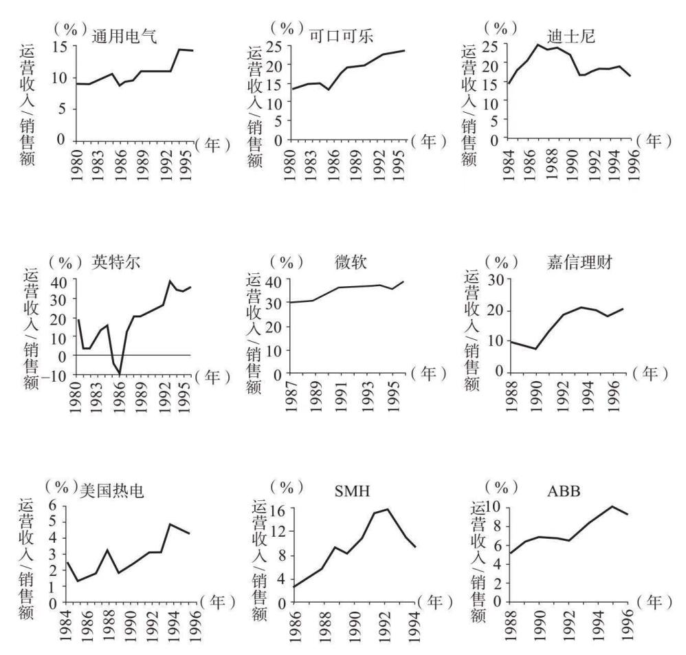 创造持续的价值增长要求每隔5年就对企业设计进行调整。不少创新公司已经证明,这一要求不仅可能实现,而且会带来非同一般的结果。注意下图1和图2中体现出的因果关系。可口可乐公司企业设计的变化(从装瓶商特许经营模式到美国装瓶商管理模式,再到国际价值链管理模式),尽管提高了公司的资产密集度,但它显著改善了其他方面的财务指标(销售利润率、预期利润增长率和战略控制或利润保护)。这些财务参数的变化提高了公司的估值,其市值与销售额的比值从1980年的0.7提高到1996年的7.0(见图2)。总体来看,这些因素为可口可乐公司创造了长期的价值增长,使它成为世界上最具价值的公司之一。