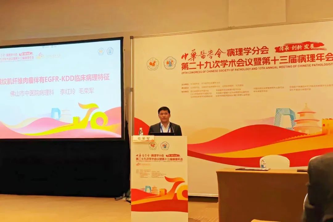 在国际软组织病理专场,毛荣军进行了题为“婴幼儿横纹肌纤维肉瘤伴有EGFR KDD”的演讲。婴幼儿横纹肌纤维肉瘤是一种极其罕见的高度恶性肿瘤,目前国际上报道不足10例。该种病变形态学上易与婴儿纤维肉瘤混淆,但在有限的病例报道中,两者预后差别巨大,因此明确诊断非常重要。尤为重要的是,在国际上首次发现了该病变具有EGFR激酶结构域的串联重复,为该病变应用激酶抑制剂靶向治疗提供了重要的依据。