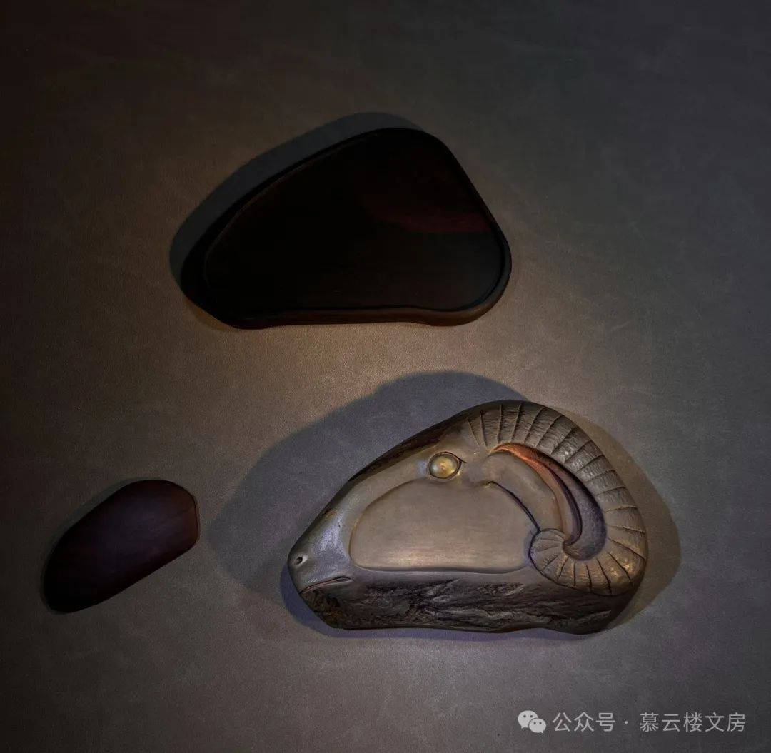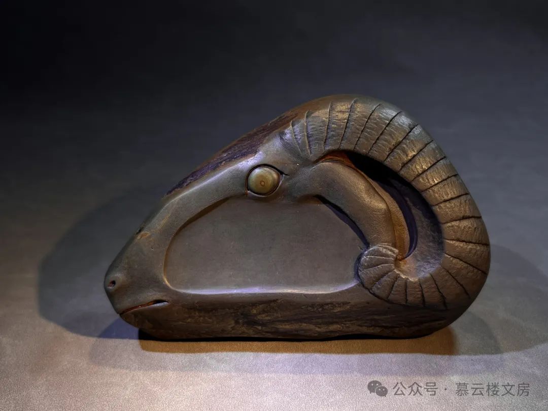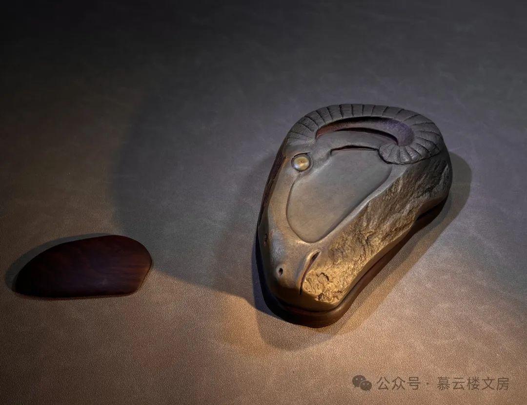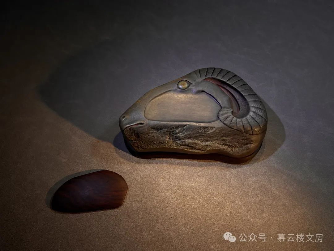 作者:伟光 此砚以端石制,石质细腻温润。因石形类三角且有天然石眼一颗故就其形设计成仿生羊头砚。石之外形基本未加过份修整保留大部分石皮,而且石眼为活眼,晴珠俱在炯炯有神,真天之佳作也。“羊”字古文通“祥”,自古便是吉祥佳瑞之象征,于是砚背刻“羊”之文字的演变历程并加以注解。此砚料佳工精形真意切天人合一,确实是一方不可复制之妙品。慕云楼《意与古会砚 》