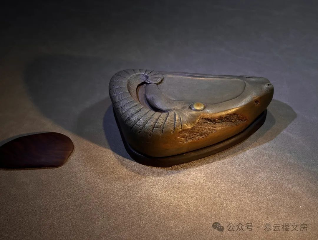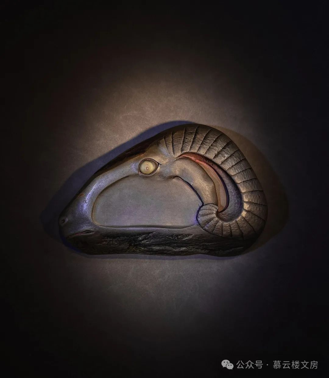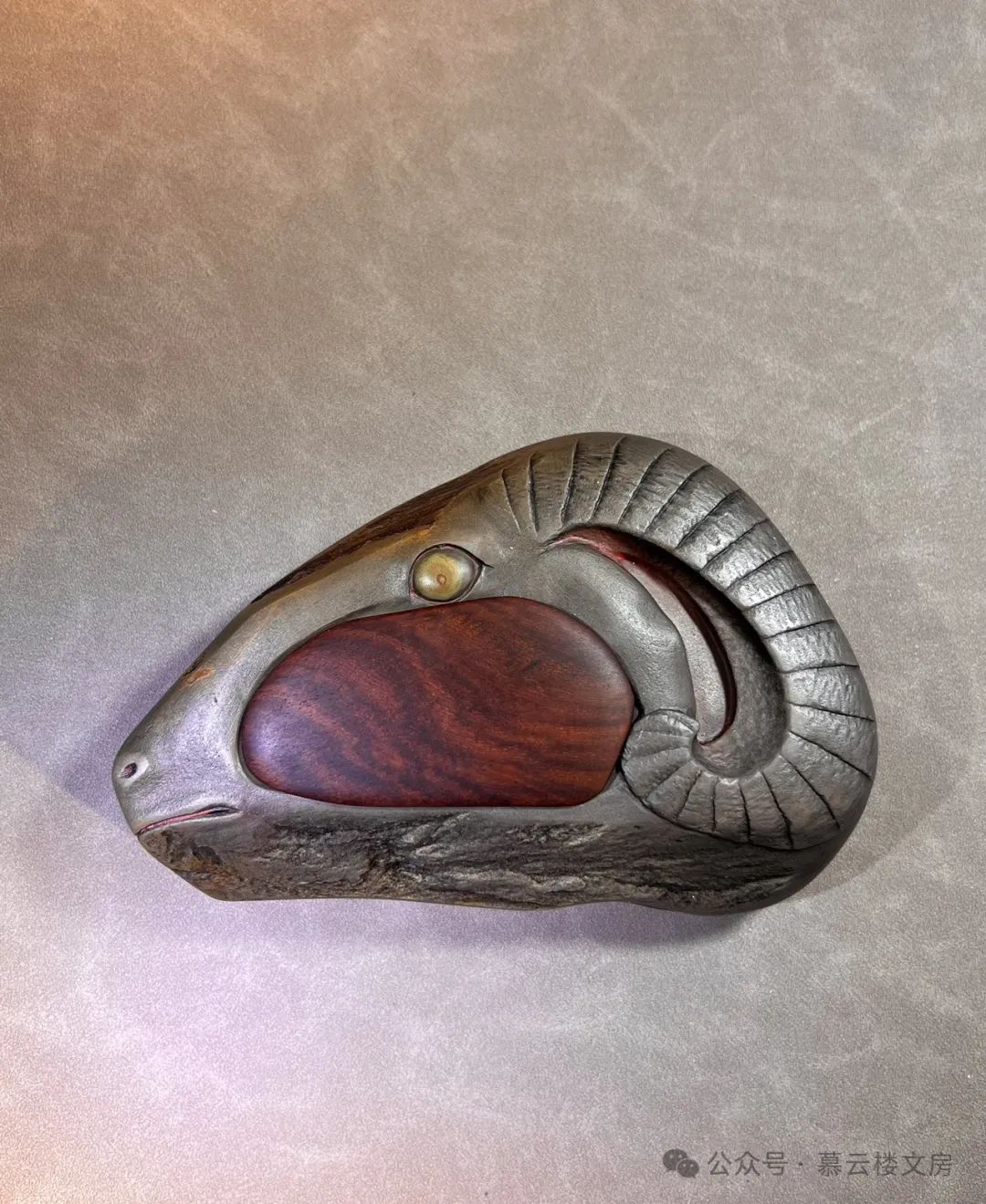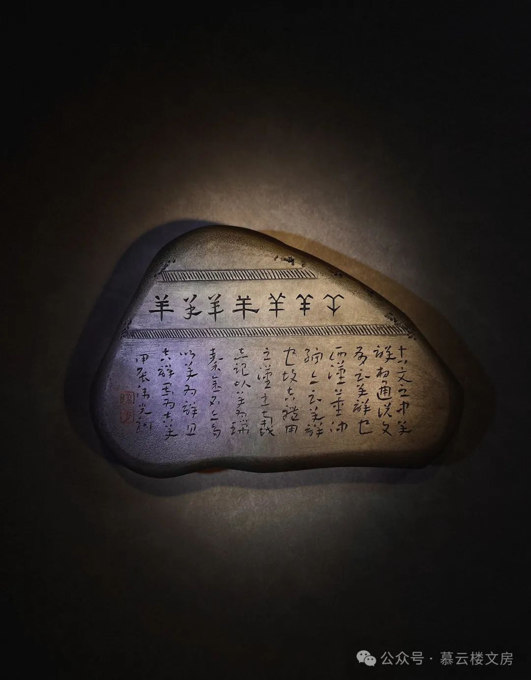 作者:伟光 此砚以端石制,石质细腻温润。因石形类三角且有天然石眼一颗故就其形设计成仿生羊头砚。石之外形基本未加过份修整保留大部分石皮,而且石眼为活眼,晴珠俱在炯炯有神,真天之佳作也。“羊”字古文通“祥”,自古便是吉祥佳瑞之象征,于是砚背刻“羊”之文字的演变历程并加以注解。此砚料佳工精形真意切天人合一,确实是一方不可复制之妙品。慕云楼《意与古会砚 》