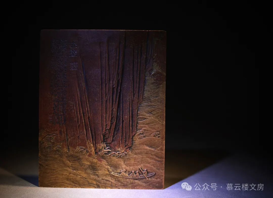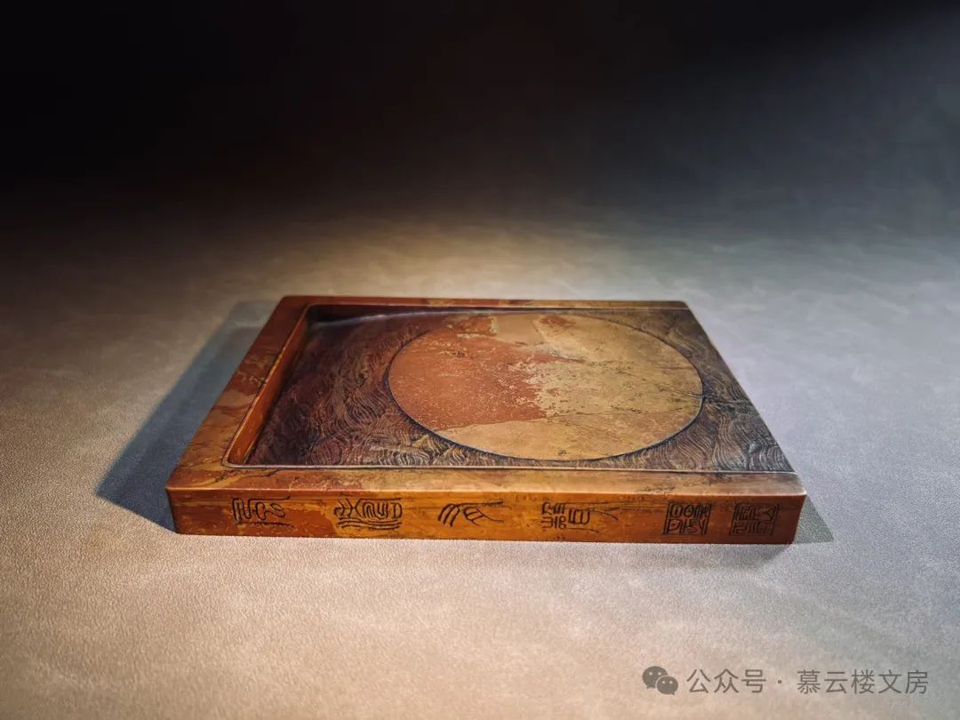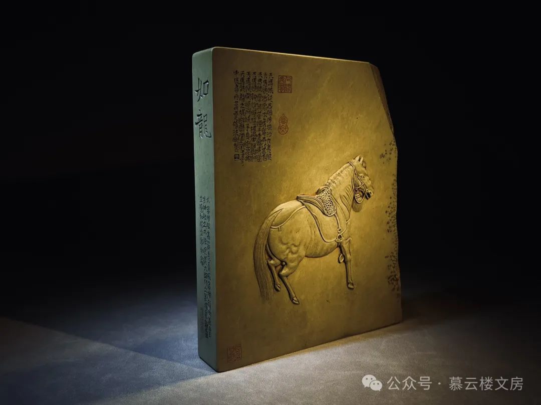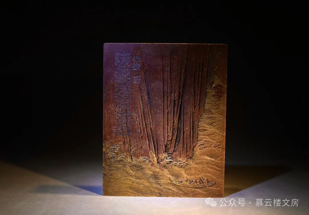 作者:甜此砚取材山东红丝石,石质细腻,通体红黄两色,砚取规矩形,器规整,气场大,正面开海天初月式传统砚池,储墨实用。砚背巧借石头本身的颜色对比雕刻苏东坡赤壁怀古诗意图,壁立千仞,江流有声,惊涛拍岸,尽显大气,此砚意境深远神秘,线条刚柔相济,气息高古,立意精妙,有大开大合之势,指掌之中蕴藏乾坤气象,是收藏把玩实用不可多得之妙品。慕云楼《如龙》砚