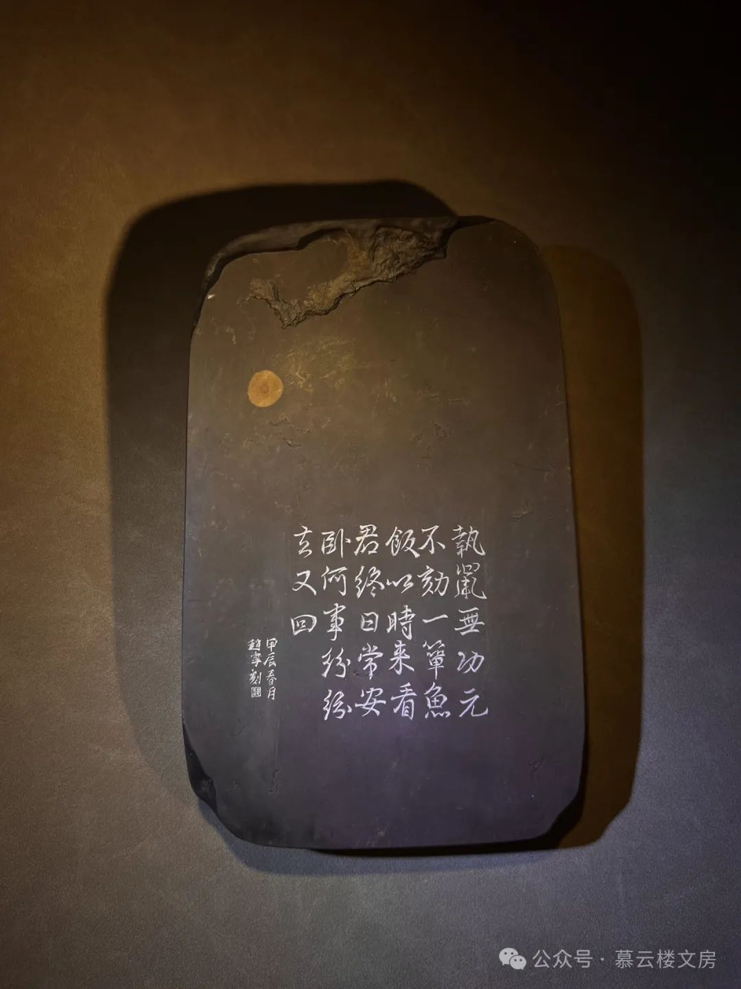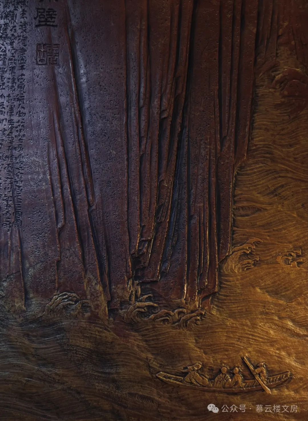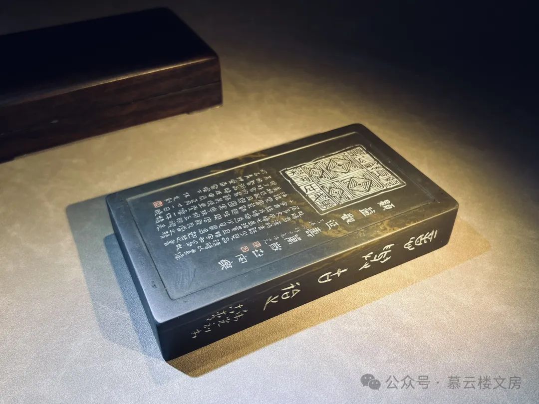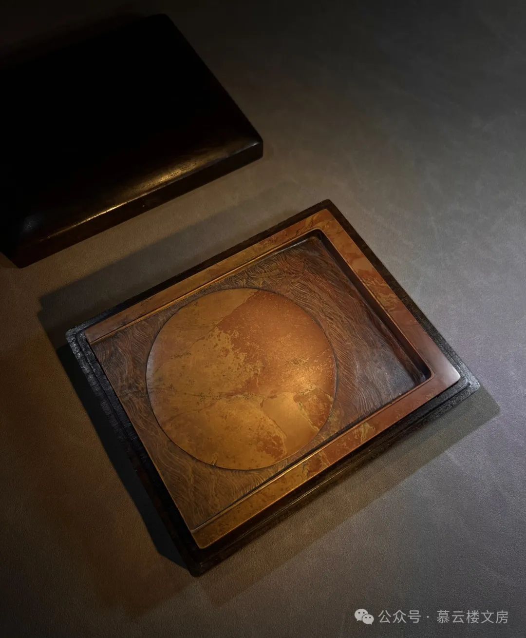 作者:甜此砚取材山东红丝石,石质细腻,通体红黄两色,砚取规矩形,器规整,气场大,正面开海天初月式传统砚池,储墨实用。砚背巧借石头本身的颜色对比雕刻苏东坡赤壁怀古诗意图,壁立千仞,江流有声,惊涛拍岸,尽显大气,此砚意境深远神秘,线条刚柔相济,气息高古,立意精妙,有大开大合之势,指掌之中蕴藏乾坤气象,是收藏把玩实用不可多得之妙品。慕云楼《如龙》砚