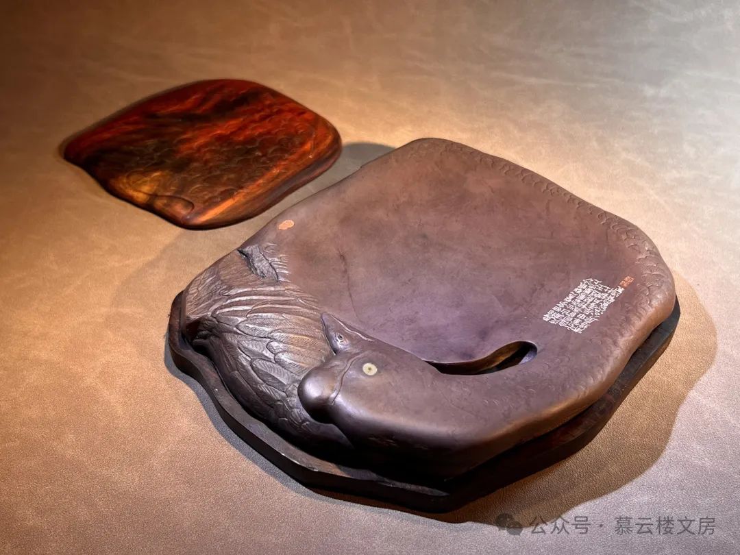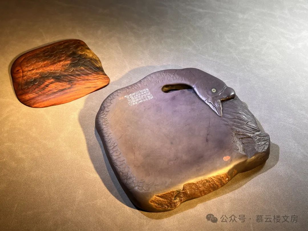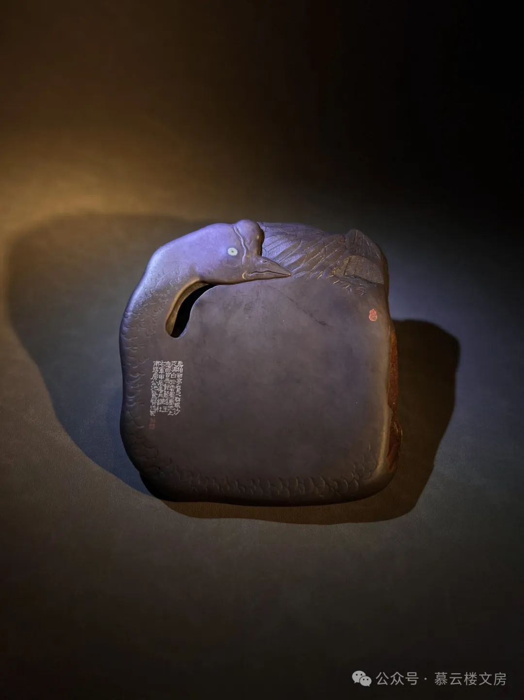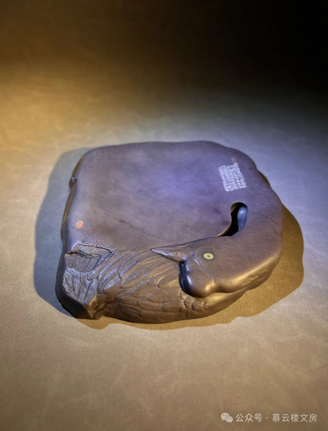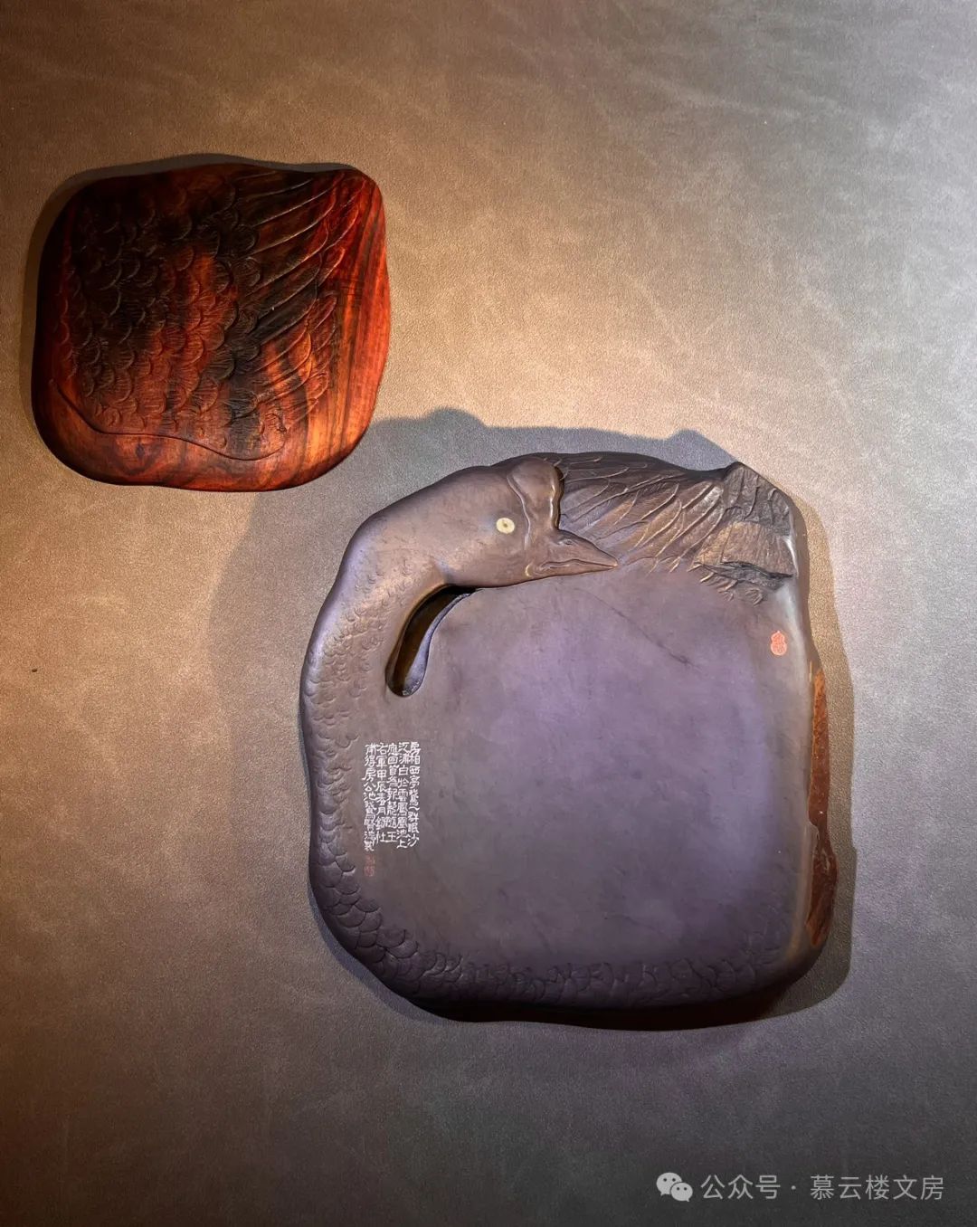 砚为端石麻子坑所制,下发墨效果佳。砚取随形,正面雕刻一只猫,雕刻细腻,线条生动,下方刻虫蛀池,池内雕一只老鼠。作品的构图形式与左侧诗句吻合,寓意“尽护山房万卷书”。“玄猫”是古人对黑猫的雅称,传说玄猫不但能捉鼠护家亦有辟邪秽之能。陆游是爱猫之人,作品中出现的诗句均为陆游所做。此砚配底座和盖,气息高雅,是不可多得的文房雅器。慕云楼《鹅砚》