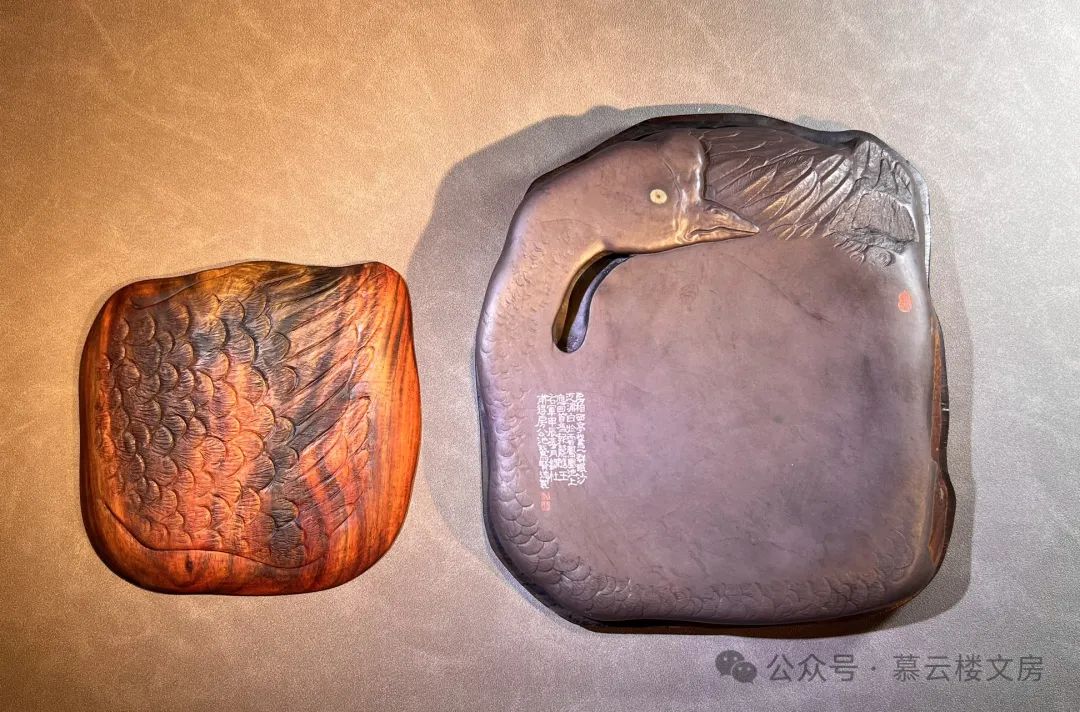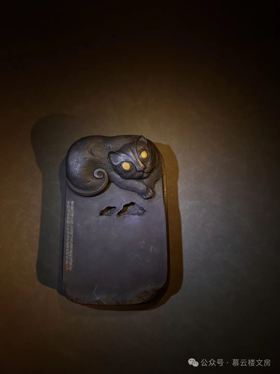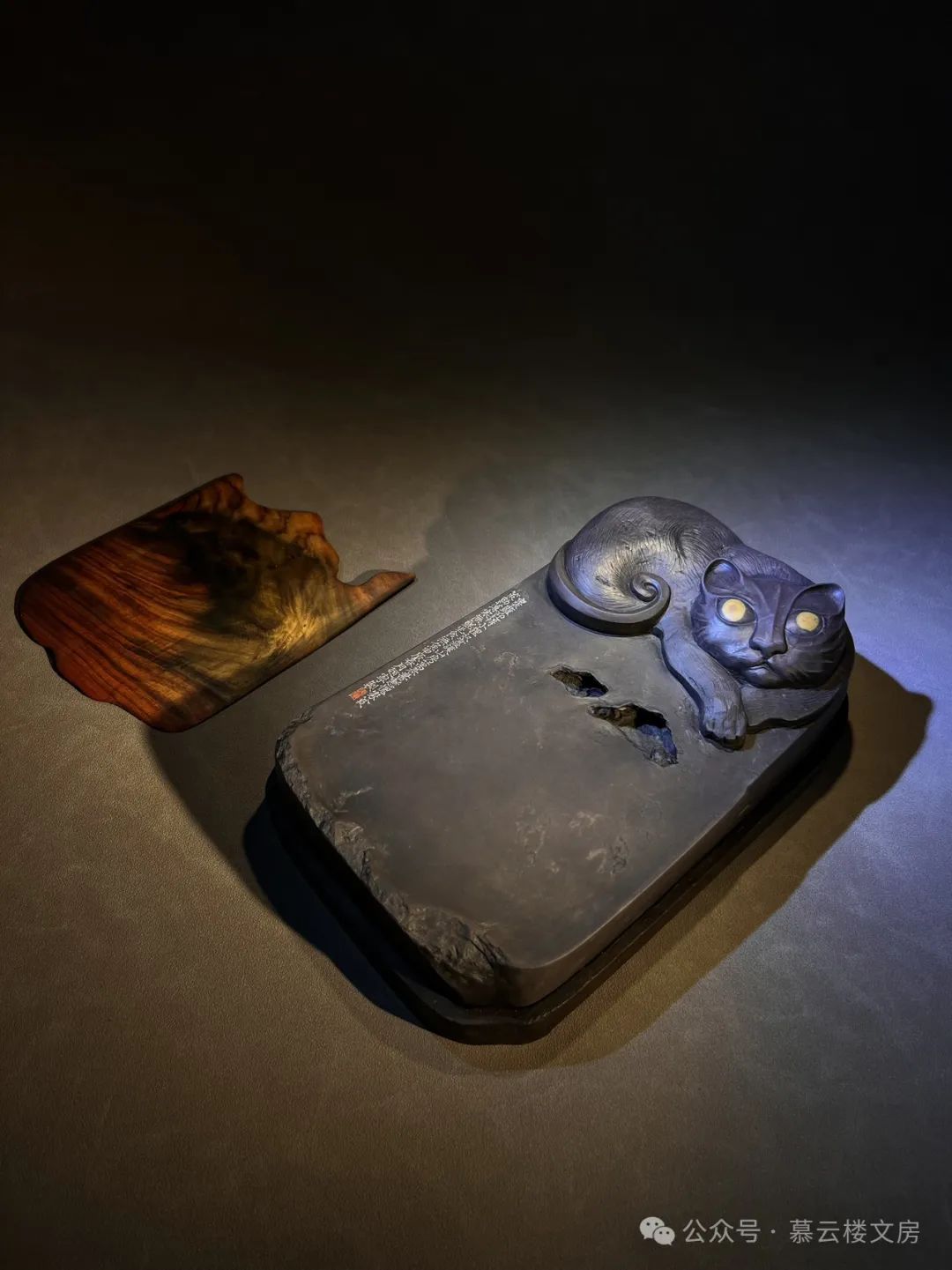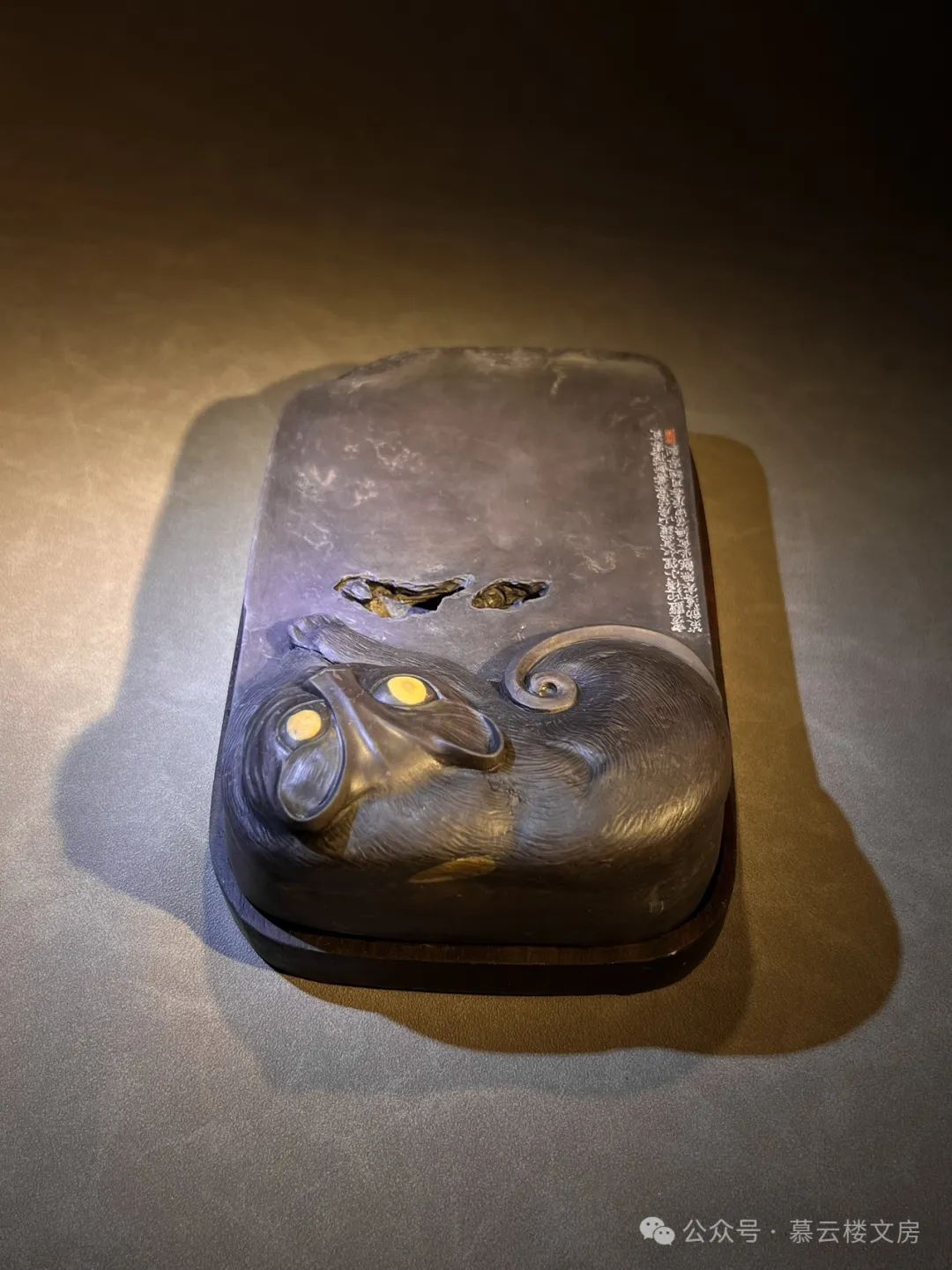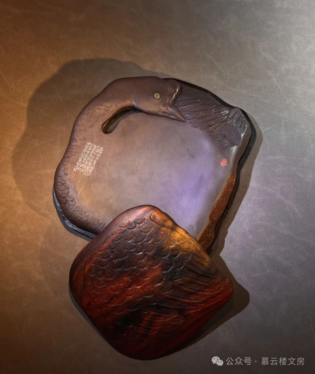砚为端石麻子坑所制,下发墨效果佳。砚取随形,正面雕刻一只猫,雕刻细腻,线条生动,下方刻虫蛀池,池内雕一只老鼠。作品的构图形式与左侧诗句吻合,寓意“尽护山房万卷书”。“玄猫”是古人对黑猫的雅称,传说玄猫不但能捉鼠护家亦有辟邪秽之能。陆游是爱猫之人,作品中出现的诗句均为陆游所做。此砚配底座和盖,气息高雅,是不可多得的文房雅器。慕云楼《鹅砚》