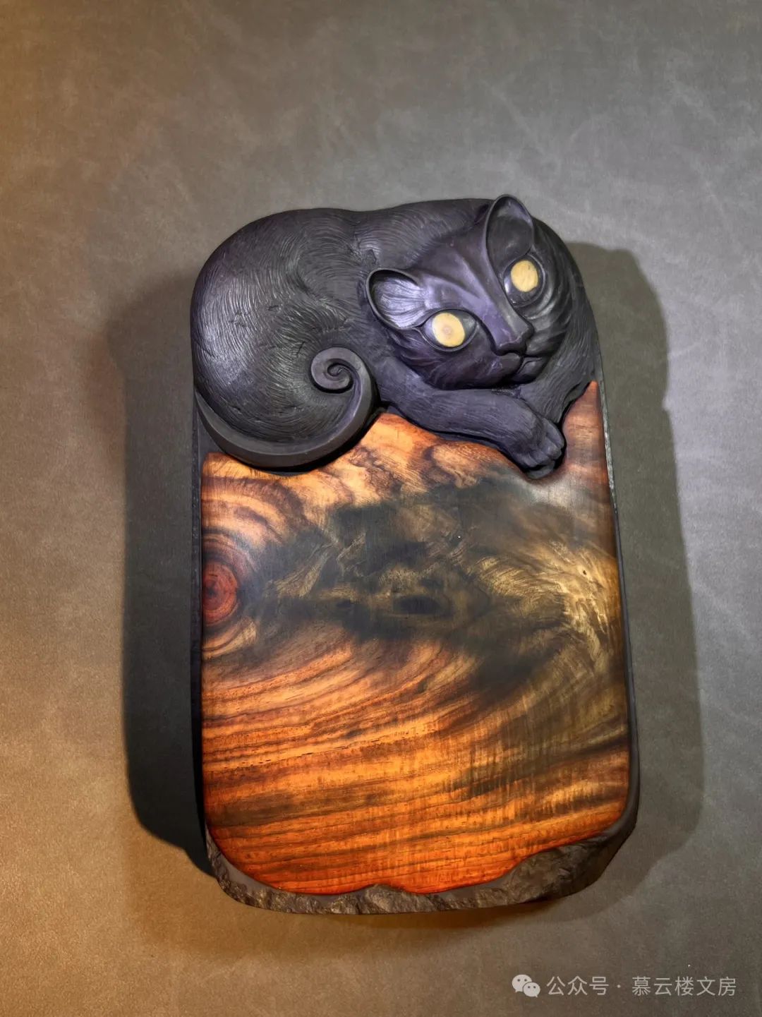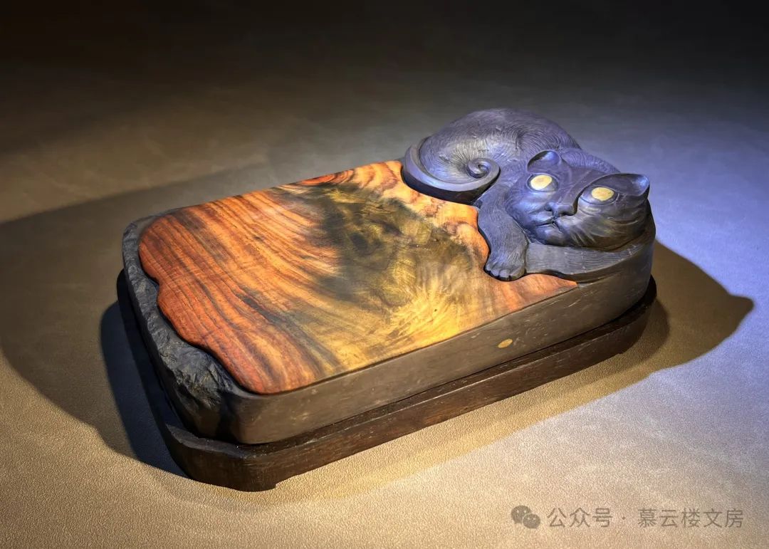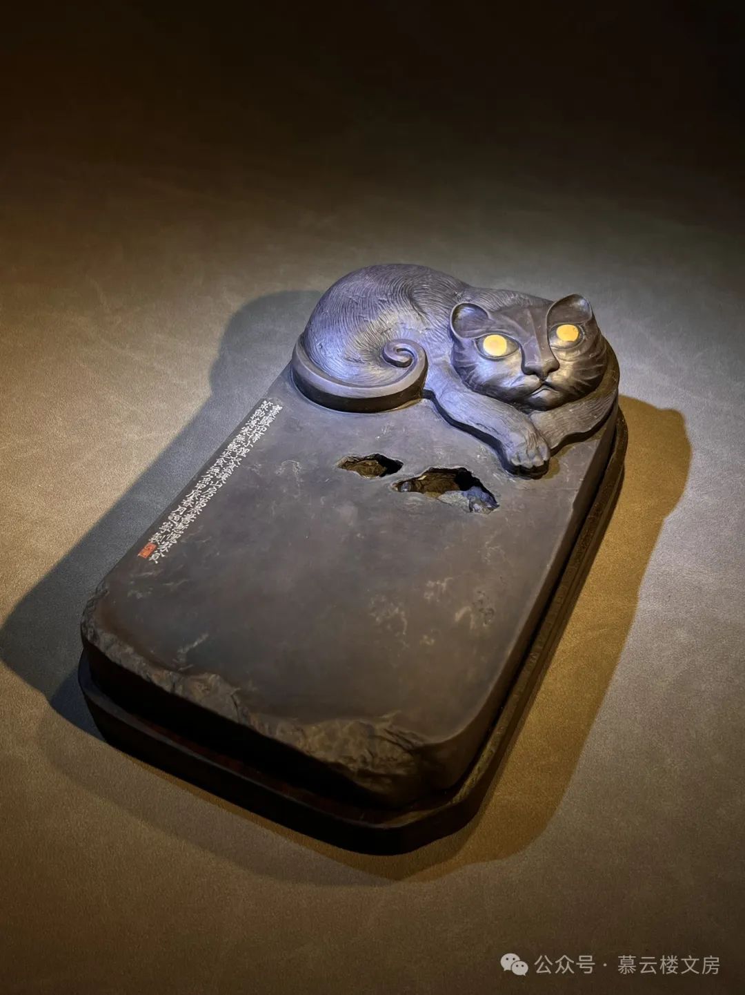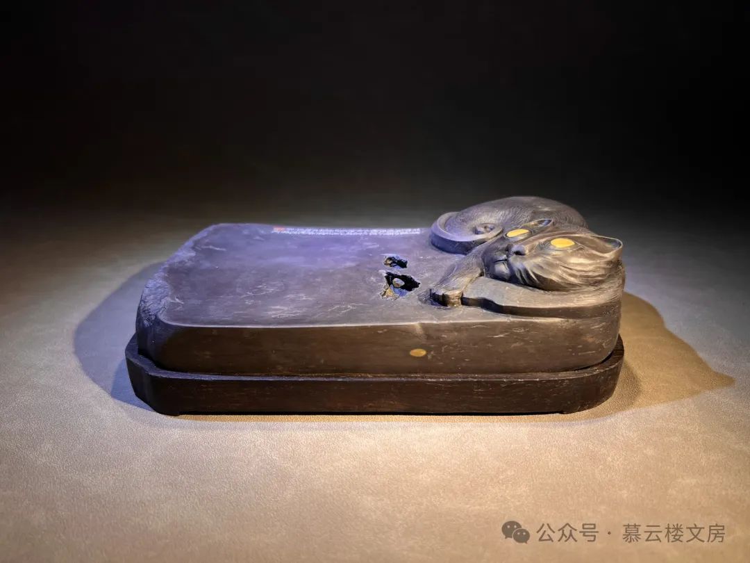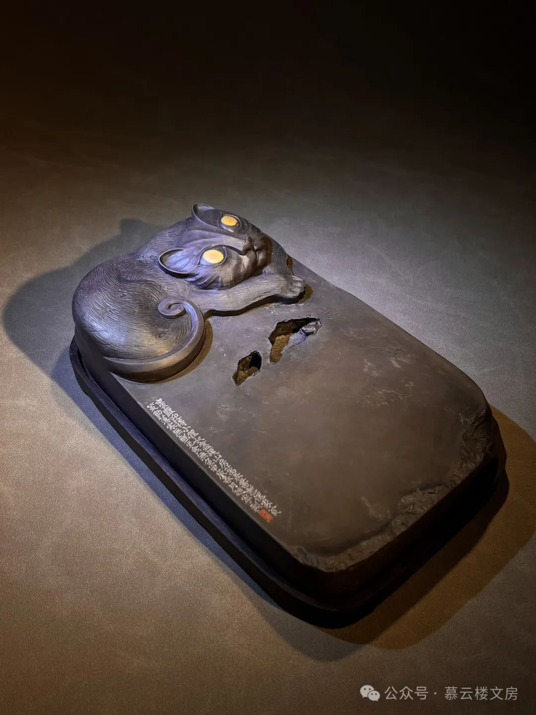 砚为端石麻子坑所制,下发墨效果佳。砚取随形,正面雕刻一只猫,雕刻细腻,线条生动,下方刻虫蛀池,池内雕一只老鼠。作品的构图形式与左侧诗句吻合,寓意“尽护山房万卷书”。“玄猫”是古人对黑猫的雅称,传说玄猫不但能捉鼠护家亦有辟邪秽之能。陆游是爱猫之人,作品中出现的诗句均为陆游所做。此砚配底座和盖,气息高雅,是不可多得的文房雅器。慕云楼《鹅砚》