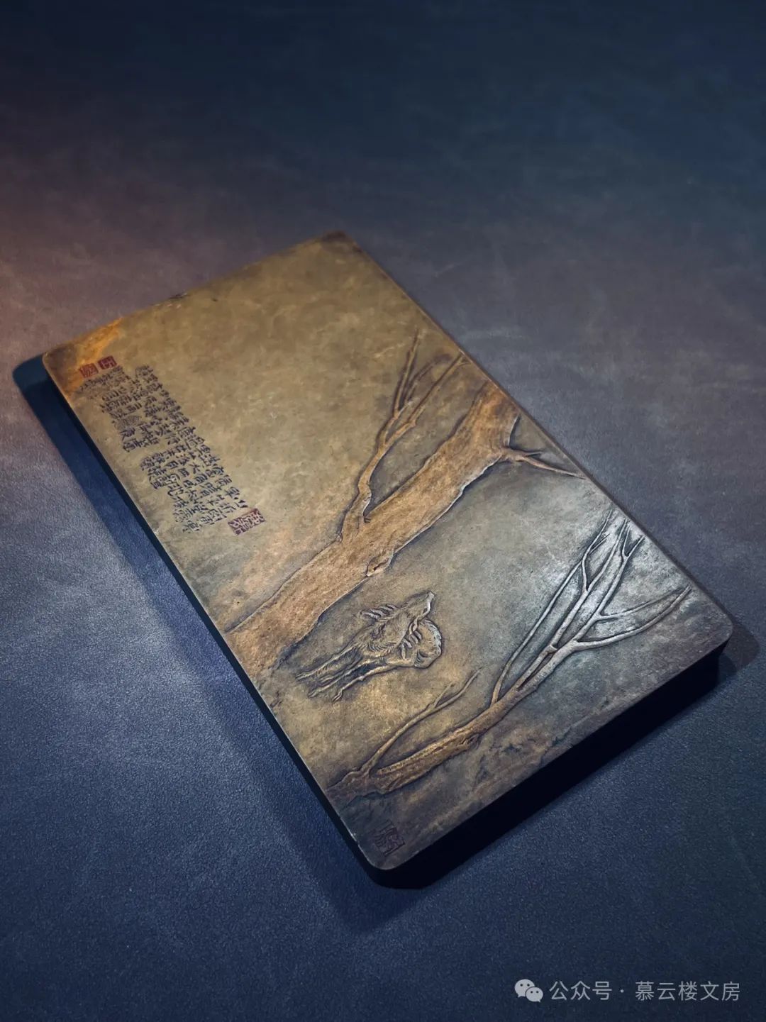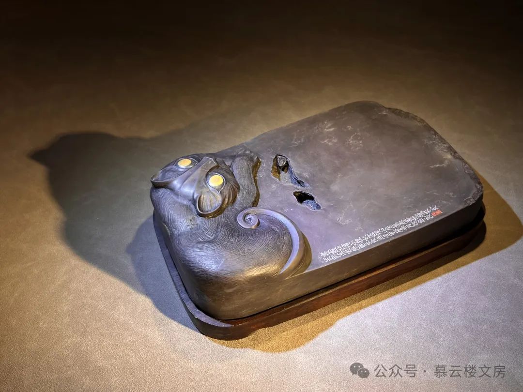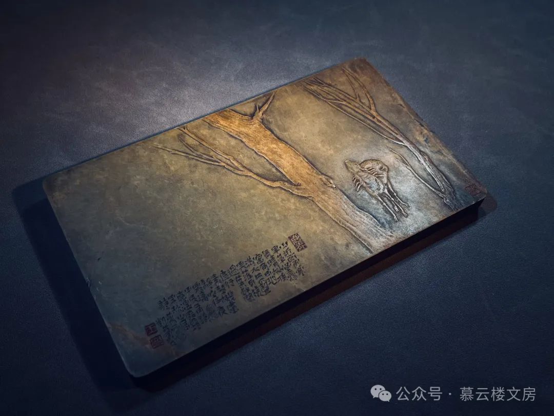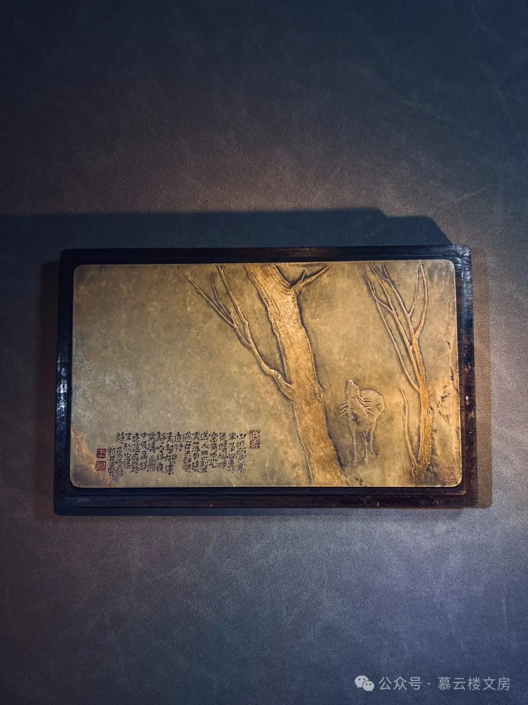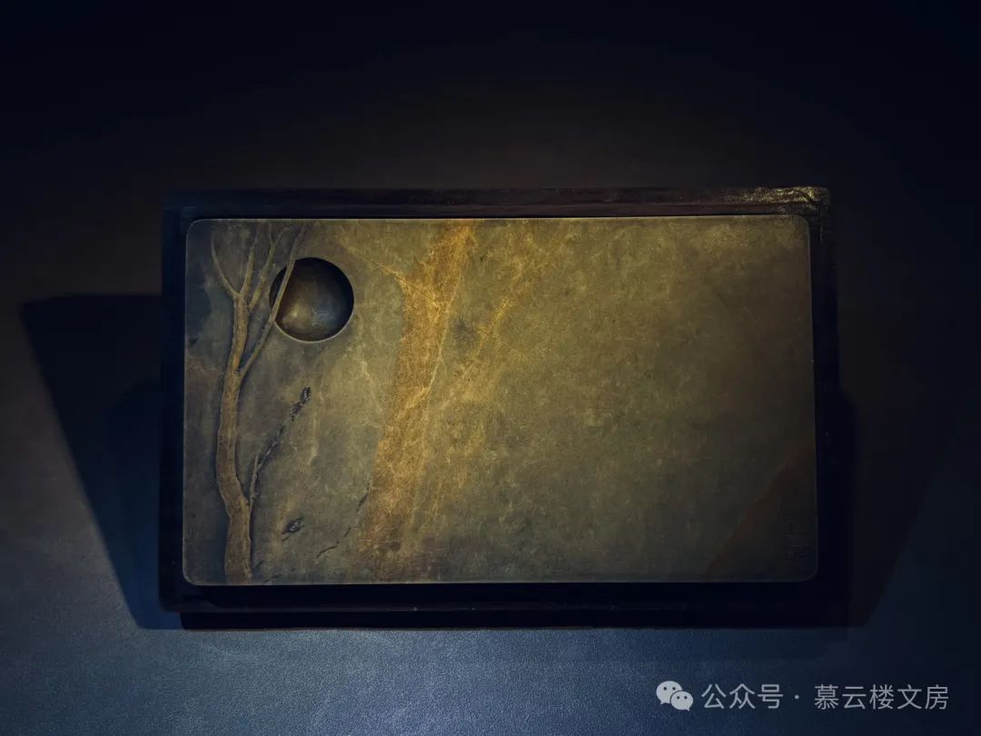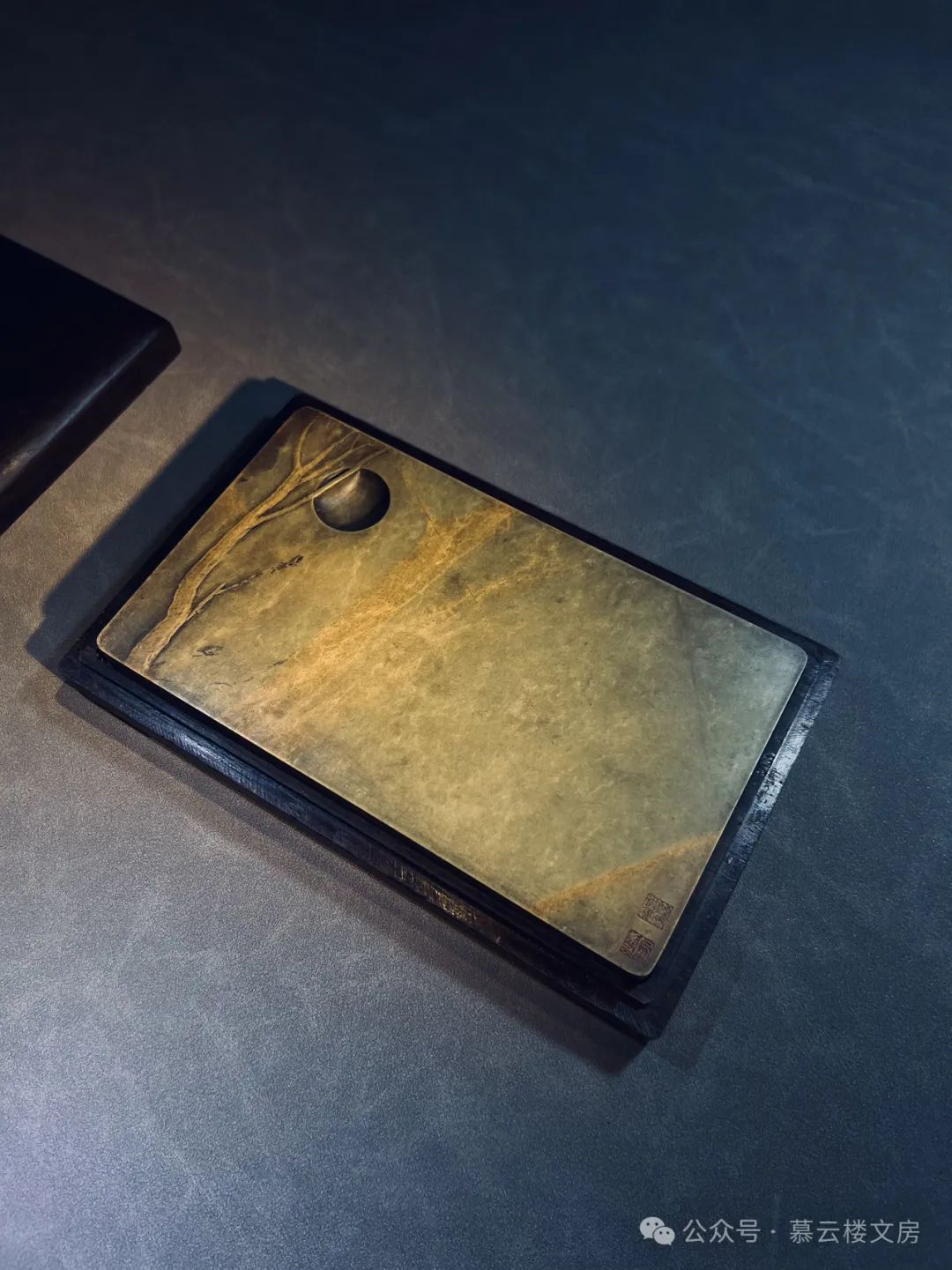 作者:凯蔷此砚由端石绿端制成,砚取方正。砚材有天然黄龙纹似树木丛林,砚背雕八大山人所作鹿一只于林中,呦呦长鸣,尽显画面空灵悠远之气。正面微凹作墨堂,开圆池于树桠之间,似一轮明月挂枝头。树深时见鹿,意境本天成。此砚尺寸适中,轻巧易携,寓意吉祥,可赏可用。慕云楼《瑞云》砚