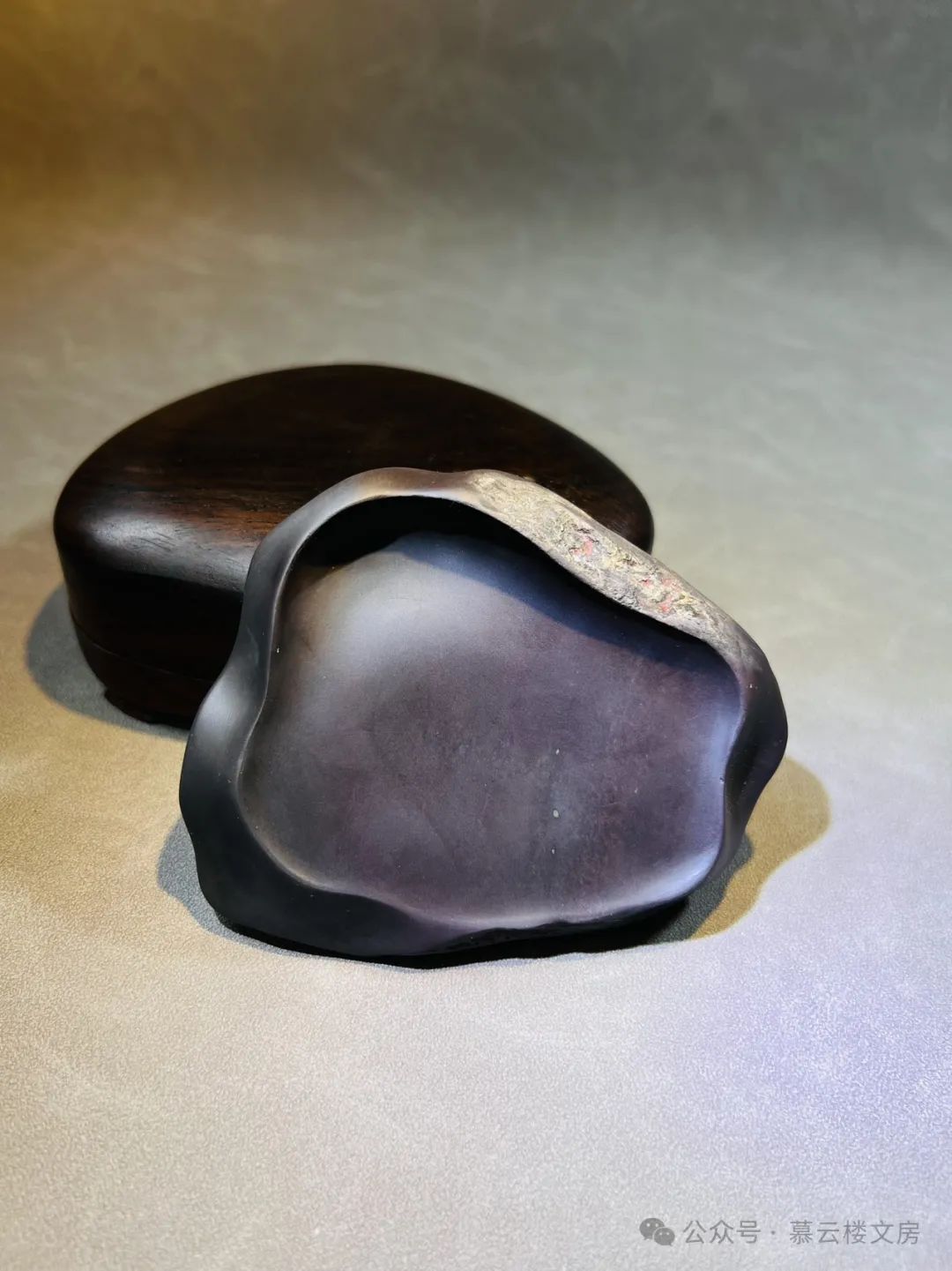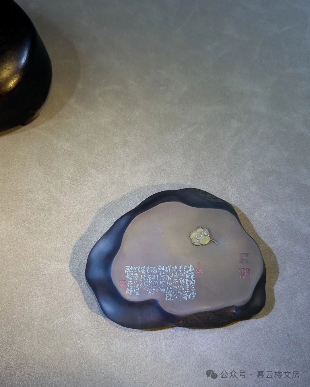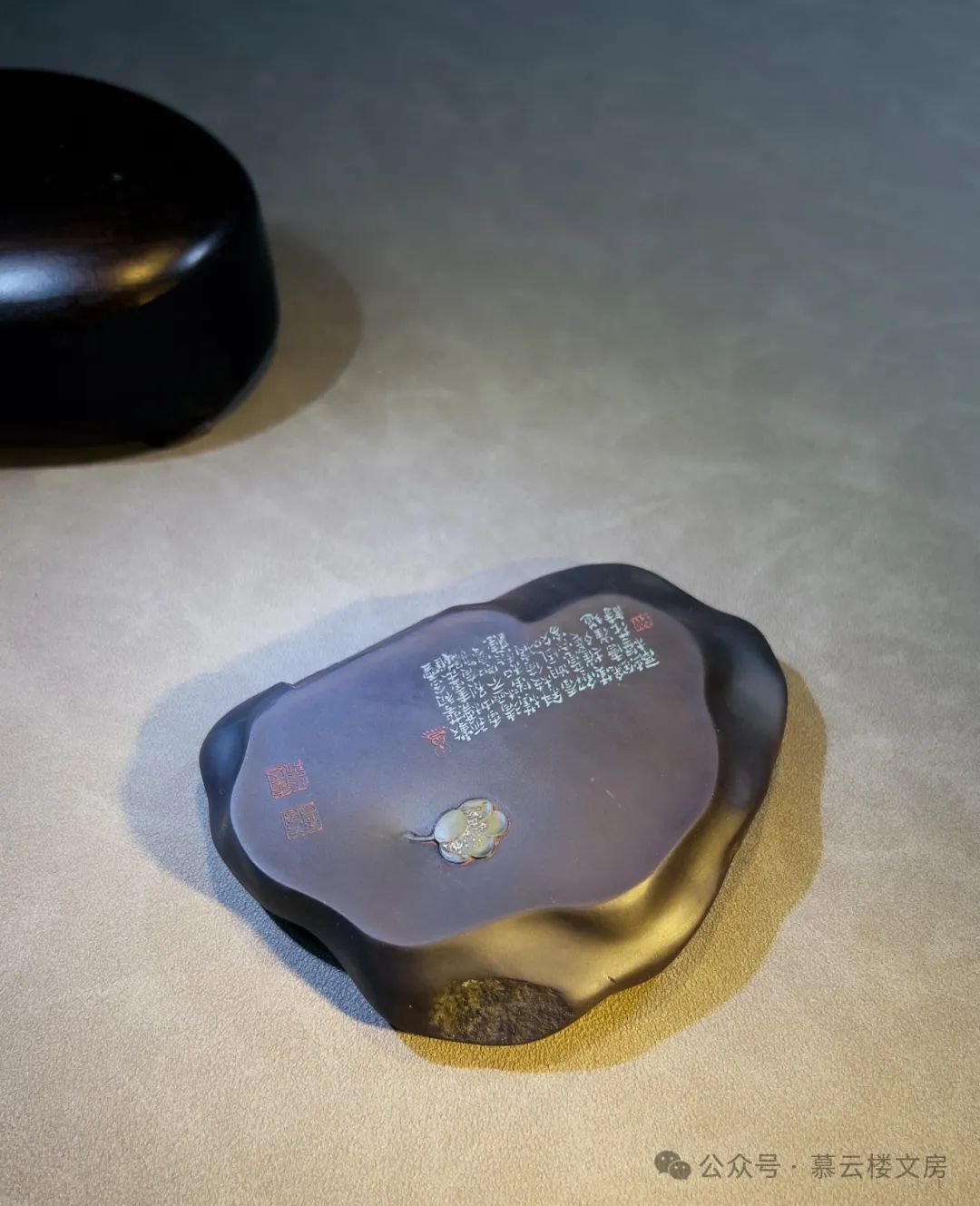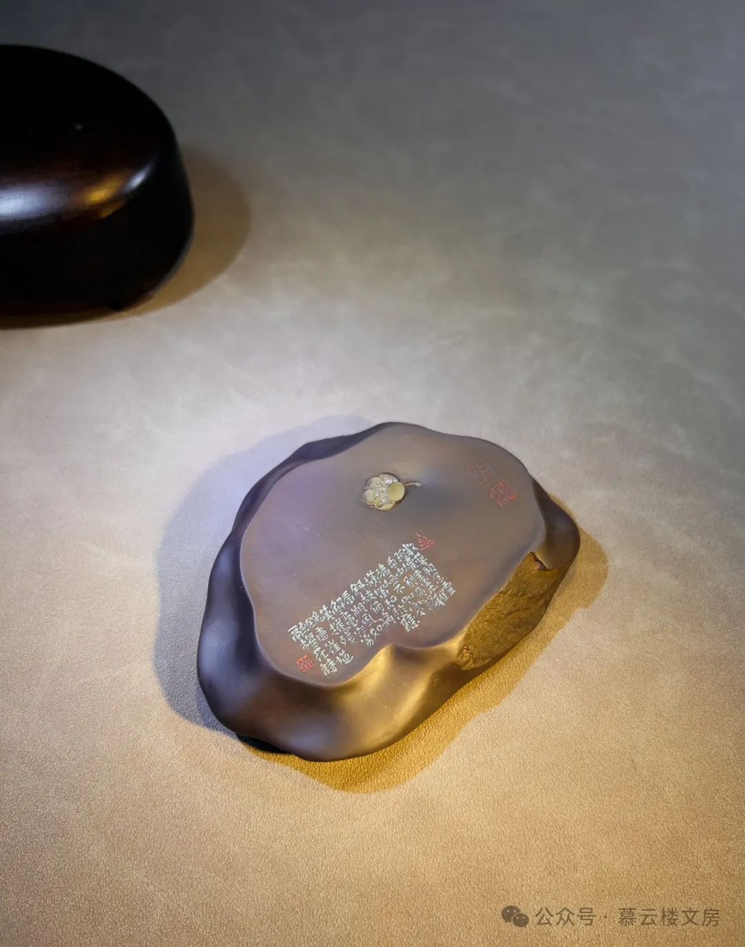 此砚以端石坑仔岩随形而制,石质莹润**,石品丰富。石形如云似水,柔中有刚。正面开素池,与整砚合而为一。砚背以一天然石眼精雕一朵梅花,意境悠美富有诗意。此砚盈一握但取形精巧文气,设计独具一格,为不可多得的珠玑之作