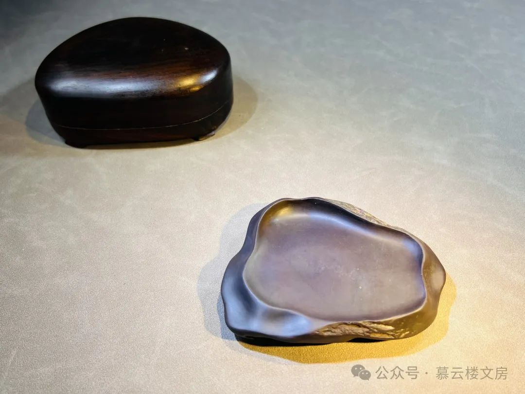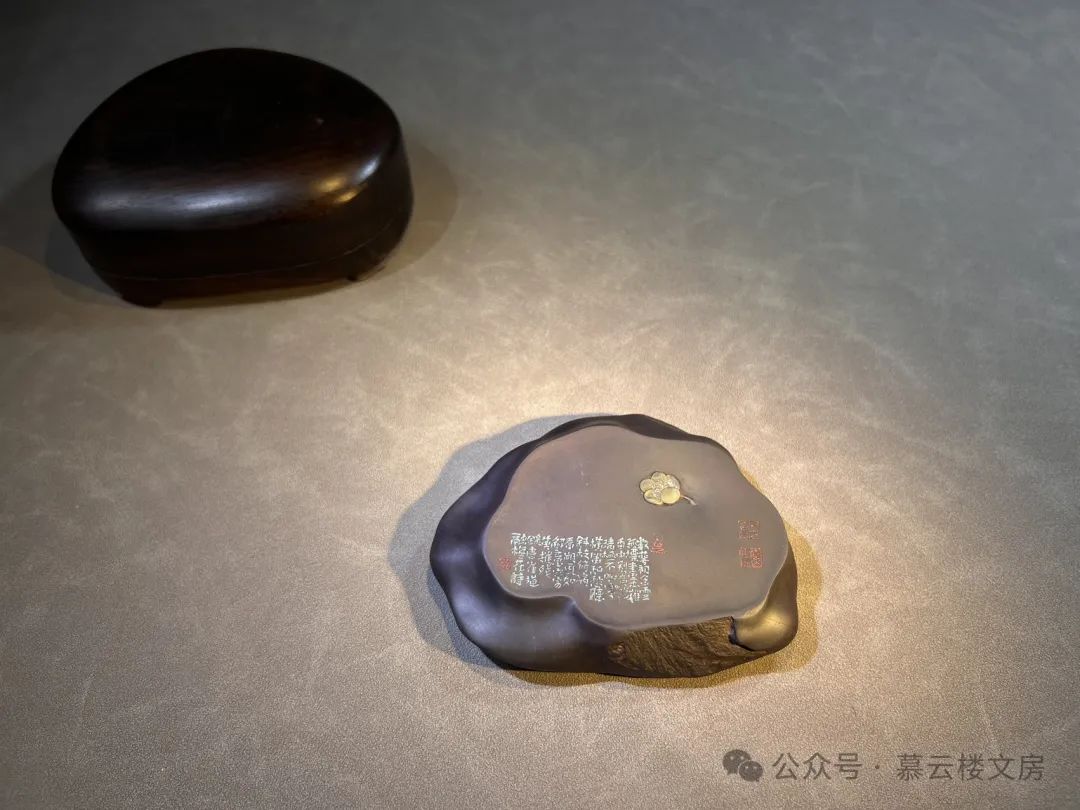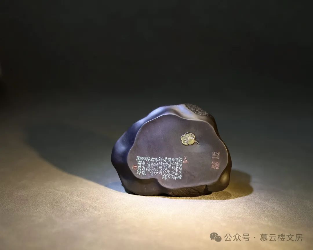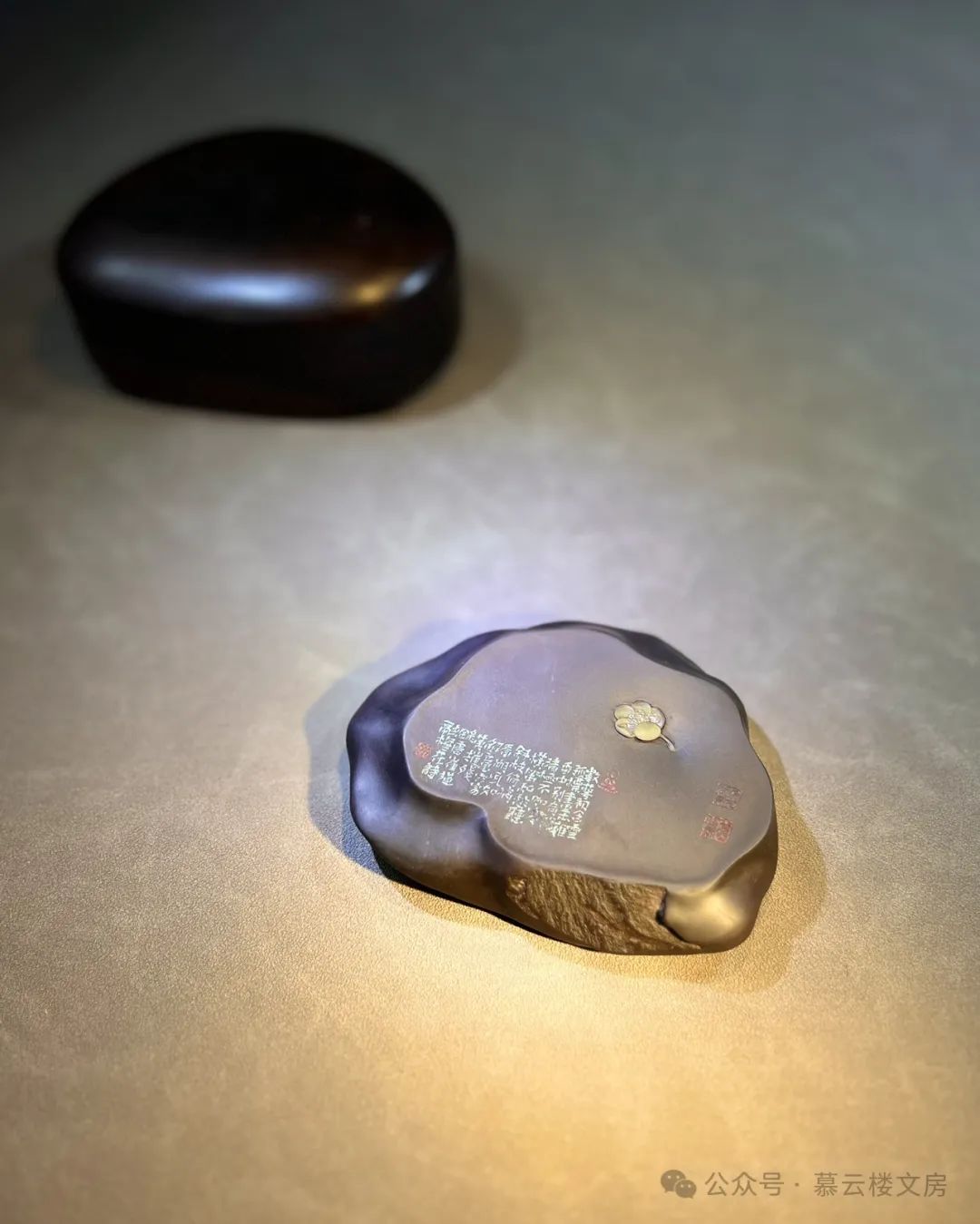 此砚以端石坑仔岩随形而制,石质莹润**,石品丰富。石形如云似水,柔中有刚。正面开素池,与整砚合而为一。砚背以一天然石眼精雕一朵梅花,意境悠美富有诗意。此砚盈一握但取形精巧文气,设计独具一格,为不可多得的珠玑之作