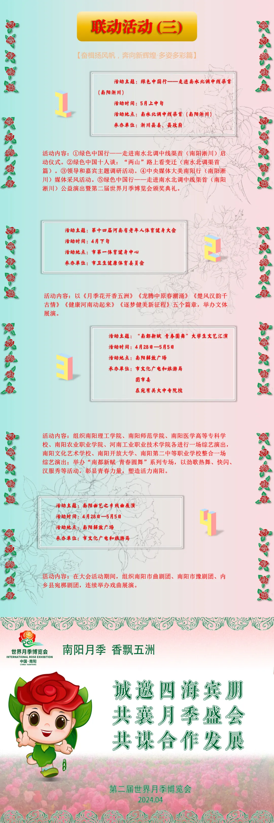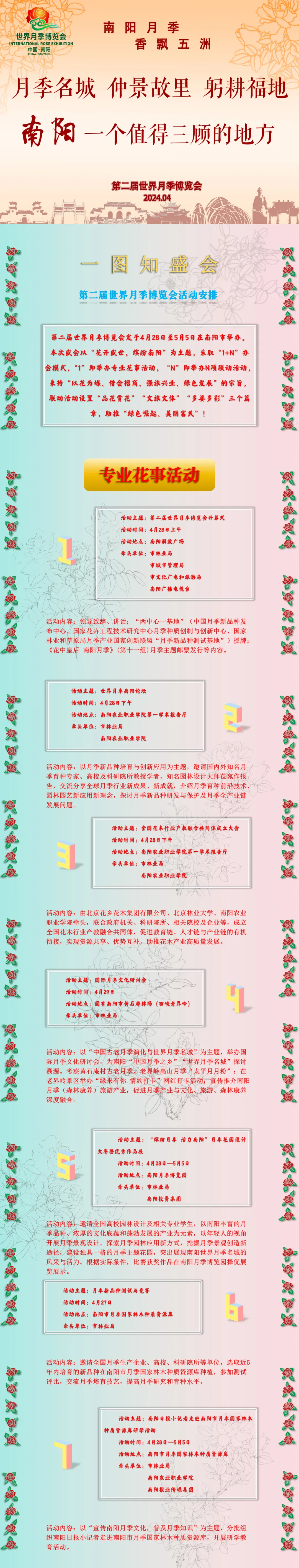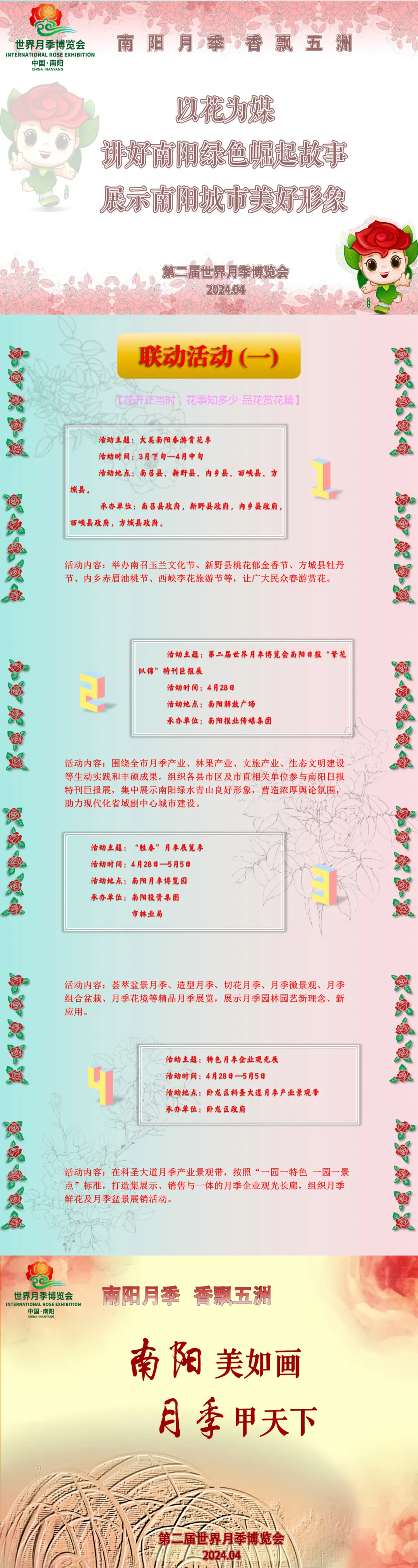最美人间四月天,月季花开正当时。月季,被誉为花中皇后,又称月月红、长春花。其花荣秀美,姿色艳丽,气味芬芳,四时常开,深受人们的喜爱。世界月季名城、中国月季之乡,四月的南阳,大街小巷、游园公园,芳华月季如仙子般娇艳绽放,处处散发着浓郁花香。每年4月下旬至5月上旬是南阳月季最佳观赏季。4月28日,第二届世界月季博览会正式开幕,南阳诚挚向您发出邀请:正值花开好时节,南阳邀您赏月季。来南阳去哪赏花?月季博览会期间两大园区有什么活动呢?这份赏花攻略您一定要收好!