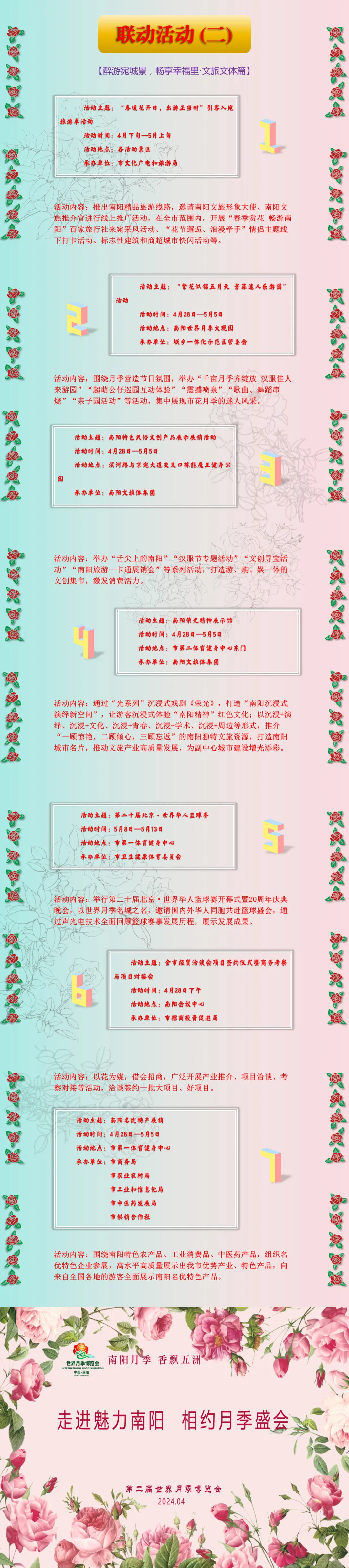 南阳世界月季大观园位于南阳市城乡一体化示范区月季大道南侧,占地面积约3200亩,种植各类月季180余万株、6100多个品种,是全国面积最大、品种数量最多的月季专类园,国家4A级旅游景区。景区分为东、中、西、北四个园区。其中,东园,有月季湖、月季大舞台、卧龙书院、游客服务中心、盆景园、月季花廊及19个城市展园等景点;中园,有月季花海、月季花坡、月季廊道等景点;北园,有科研中心、科研花圃、院士小镇等设施;西园,自西向东分别为城市活力区、静态游赏区、主题展示区、滨水活动区、湿地体验区,有月季花岛、阳光沙滩、亲子中心、滨水广场、阳光草坪、花好月圆广场、生态湿地、水街等景点。南阳世界月季大观园除月季景观之外,还有约1100种乔灌木、地被植物,500余亩的湿地水域,建筑古香古色,构筑物各具特色。园区四季常绿、四季有花,一步一景、美轮美奂。第二届世界月季博览会举办期间,该园还策划了民谣音乐基地、武林争霸大赛、“南阳味道”非遗文化美食节、12花情巡游、楚风汉韵中华婚典大秀、民族嘉年华等多项活动。1.音乐基地。与国内头部音乐机构“来呀音乐”合作,打造音乐视听盛宴。2.武林争霸。引入武当功夫团、少林武僧团,以及各大门派,结合线上直播,举办武林争霸大赛。3.“南阳味道”非遗文化美食节。利用城市馆区,引入南阳、河南非遗表演及美食,打造南阳城市客厅。4.十二花神IP。12名精通乐器的漂亮女孩,形成网红组合,作为大观园形象代言人开展互动。5.中华婚典。利用水面、花船及桥体、街区,展现中华实景婚典,打造“宛美之都爱在南阳”IP打卡地。6.民族嘉年华。引进“秘境云南”“大唐西域记”“靓丽内蒙古”“多彩贵州”等少数民族风情活动,与中原文化碰撞,带来话题流量。25路;35路;K39路;g35路;g39路;k25路;k39路:东环路月季大道南站下车步行657米35路;g39路;k25路:南阳世界月季大观园西园站下车步行773米25路;K39路;g35路;g39路;k38路;k39路:南阳世界月季大观园西园站下车步行847米中国月季园位于南阳市卧龙区孔明大道北段,独山东麓、白河之滨,园区一期面积1000余亩,种植名优月季品种2000余种,集月季品种收集、保存、展示、研发、科技示范种植、月季文化交流、农业观光旅游、研学等功能为一体的月季主题游园,被誉为“中国最美月季园”。2021年5月12日,习近平总书记来到中国月季园视察时指出:“地方特色产业发展潜力巨大,要善于挖掘和利用本地资源优势,加强地方优质品种保护,推进产、学、研有机结合,统筹做好产业、科技、文化这篇大文章”。园区主要景点有:名贵月季品种展示园、藤本月季造型园、古桩月季园、月季基因园、盆景月季园、百果园、百鸟园、月季文化展等。其中,由南阳月季基地独自研发的树状月季,形成百年古桩、一树多花的景观。用120多种藤本月季打造的九龙阵花海迷宫景观、月季王台、九宫八卦阵等景观,以其独特设计理念,用中国传统文化展现月季的摇曳多姿、色彩斑斓,令人目不暇接、心旷神怡。1.“胜春”月季展览季。汇集荟萃盆景月季、造型月季、切花月季、月季微景观、月季组合盆栽、月季花境等精品月季展览,展示月季园林园艺新理念、新应用。2.“缤纷月季活力南阳”月季花园设计大赛暨优秀作品展。联合南阳市林科院线上征集“缤纷月季活力南阳”月季花园设计作品,在园区大门外北广场以展板形式展示展览优秀作品。3.“世界月季精品园”展。展示欧洲等世界不同地区200余种精品月季,融入洲际风格的园林景观,吸引游人驻足打卡。赏花推荐地三:中心城区月季公园、月季游园、月季大道