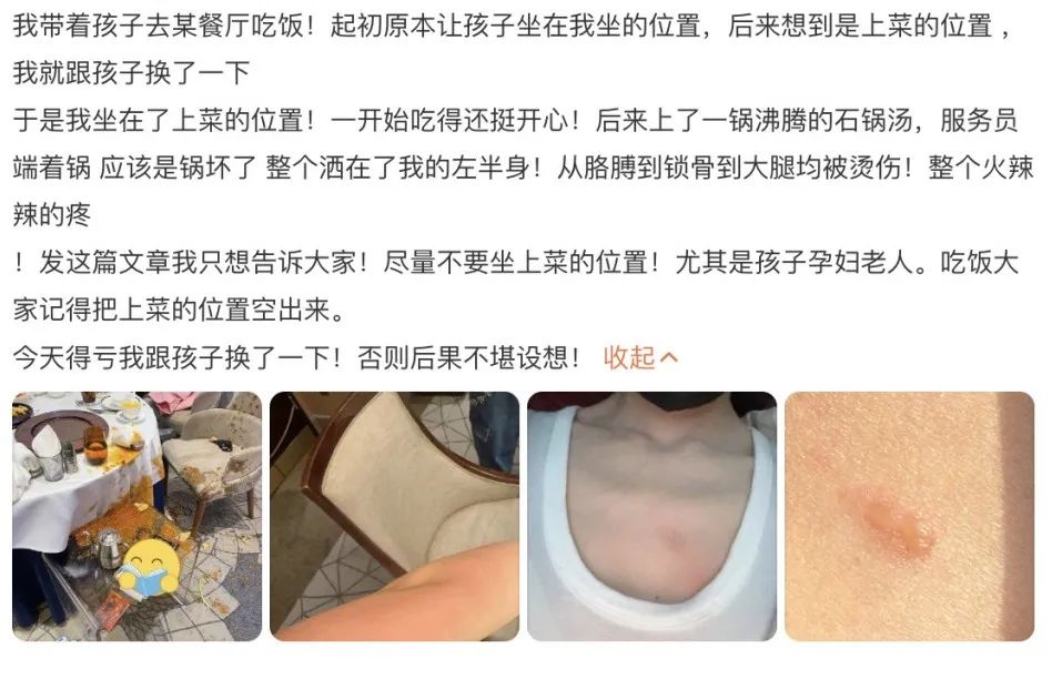 在外面下馆子时,你会避免坐在服务员上菜位置吗?4月2日,一则在餐馆吃饭被烫伤的消息冲上热搜。网友看后表示:“真是猝不及防” “一看就疼”。
