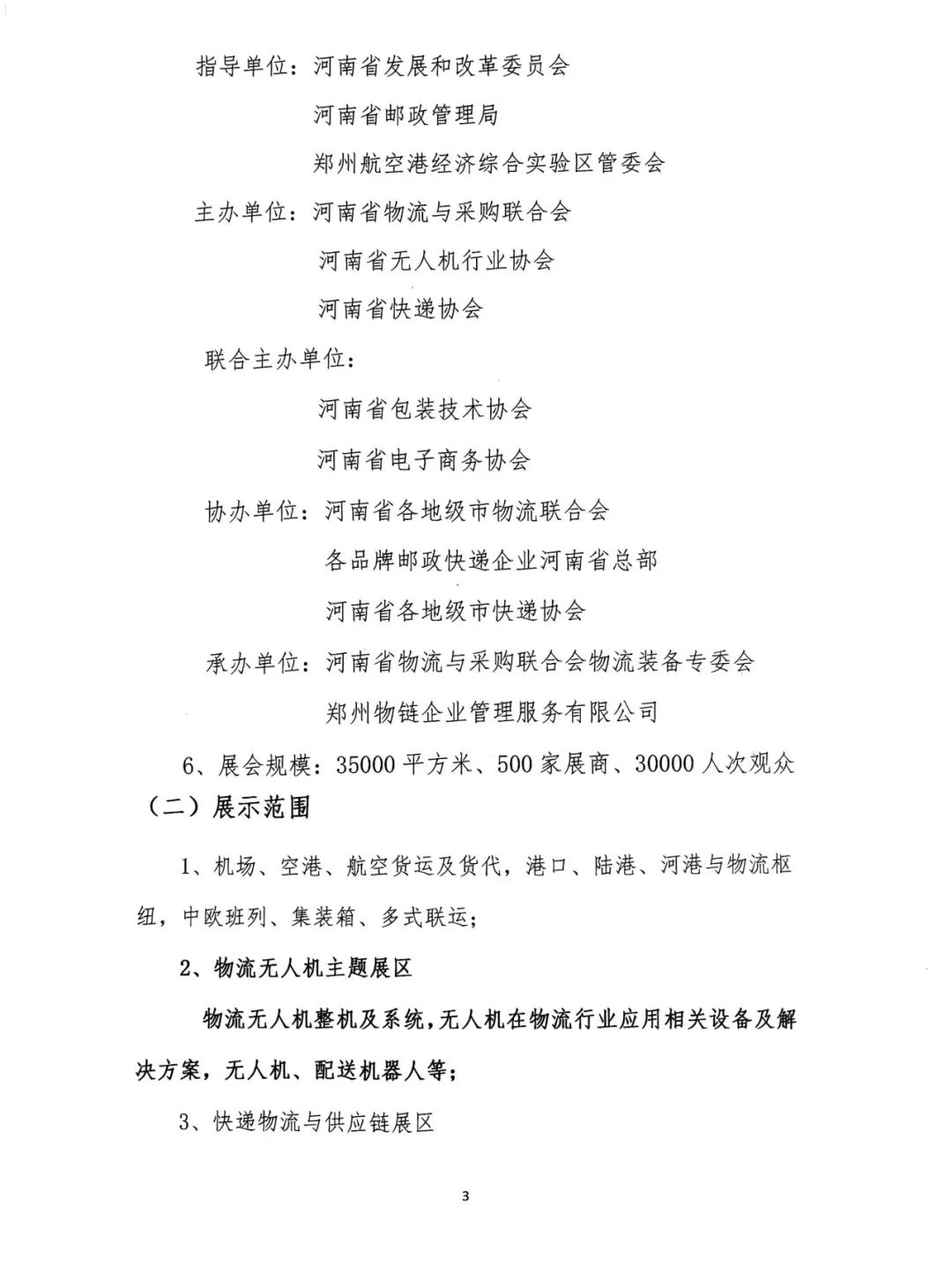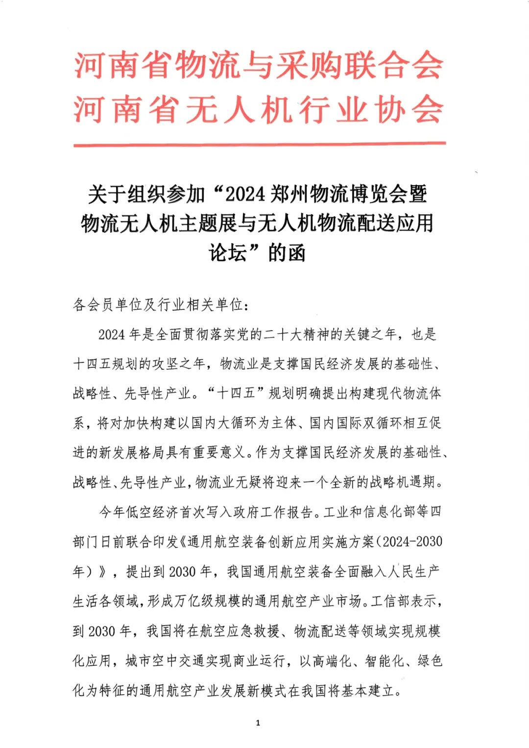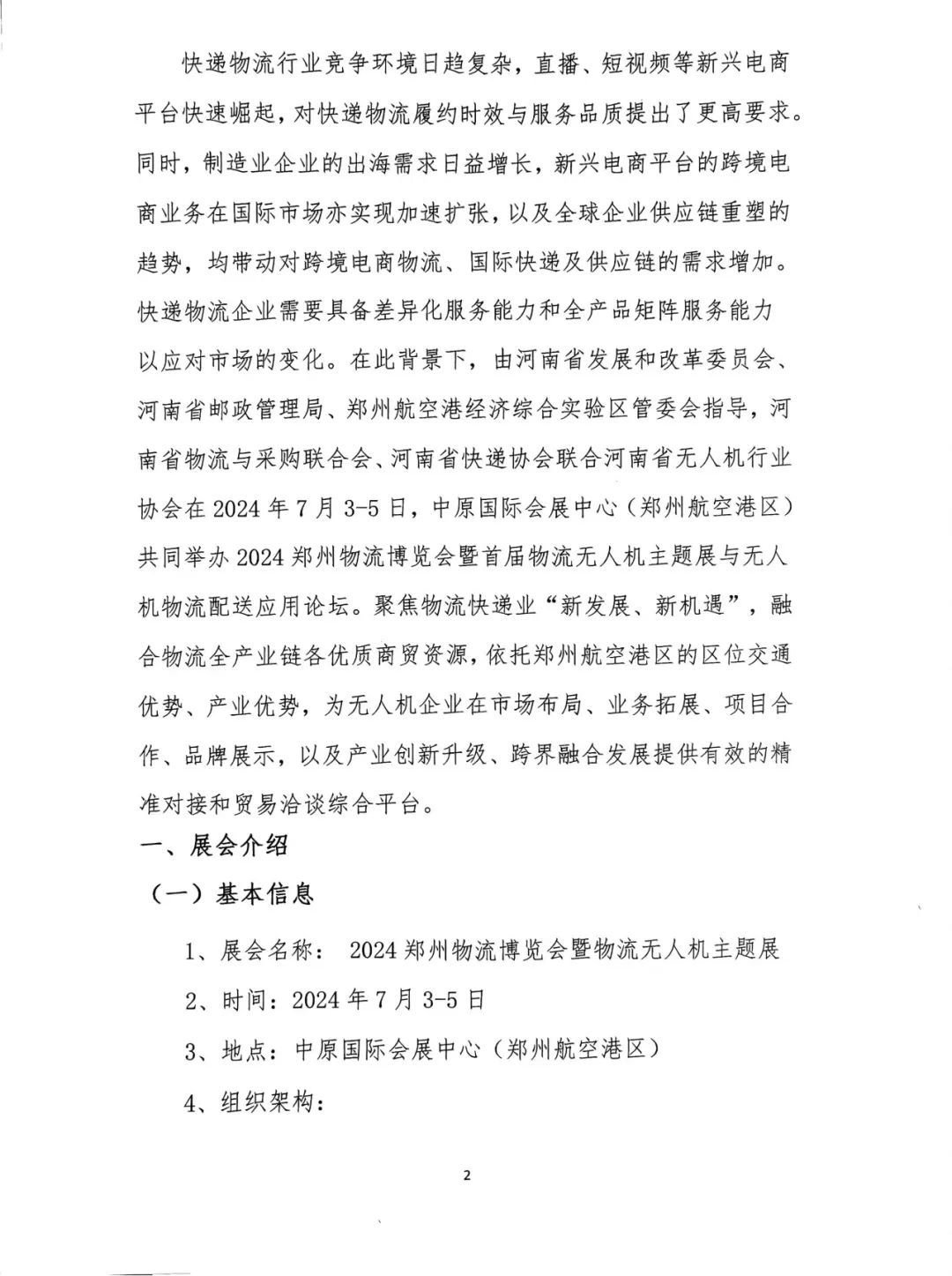 在此背景下,由河南省发展和改革委员会、河南省邮政管理局、郑州航空港经济综合实验区管委会指导,河南省物流与采购联合会、河南省快递协会联合河南省无人机行业协会在2024年7月3-5日,中原国际会展中心(郑州航空港区)共同举办2024郑州物流博览会暨首届物流无人机主题展与无人机物流配送应用论坛。聚焦物流快递业“新发展、新机遇”,融合物流全产业链各优质商贸资源,依托郑州航空港区的区位交通优势、产业优势,为无人机企业在市场布局、业务拓展、项目合作、品牌展示,以及产业创新升级、跨界融合发展提供有效的精准对接和贸易洽谈综合平台