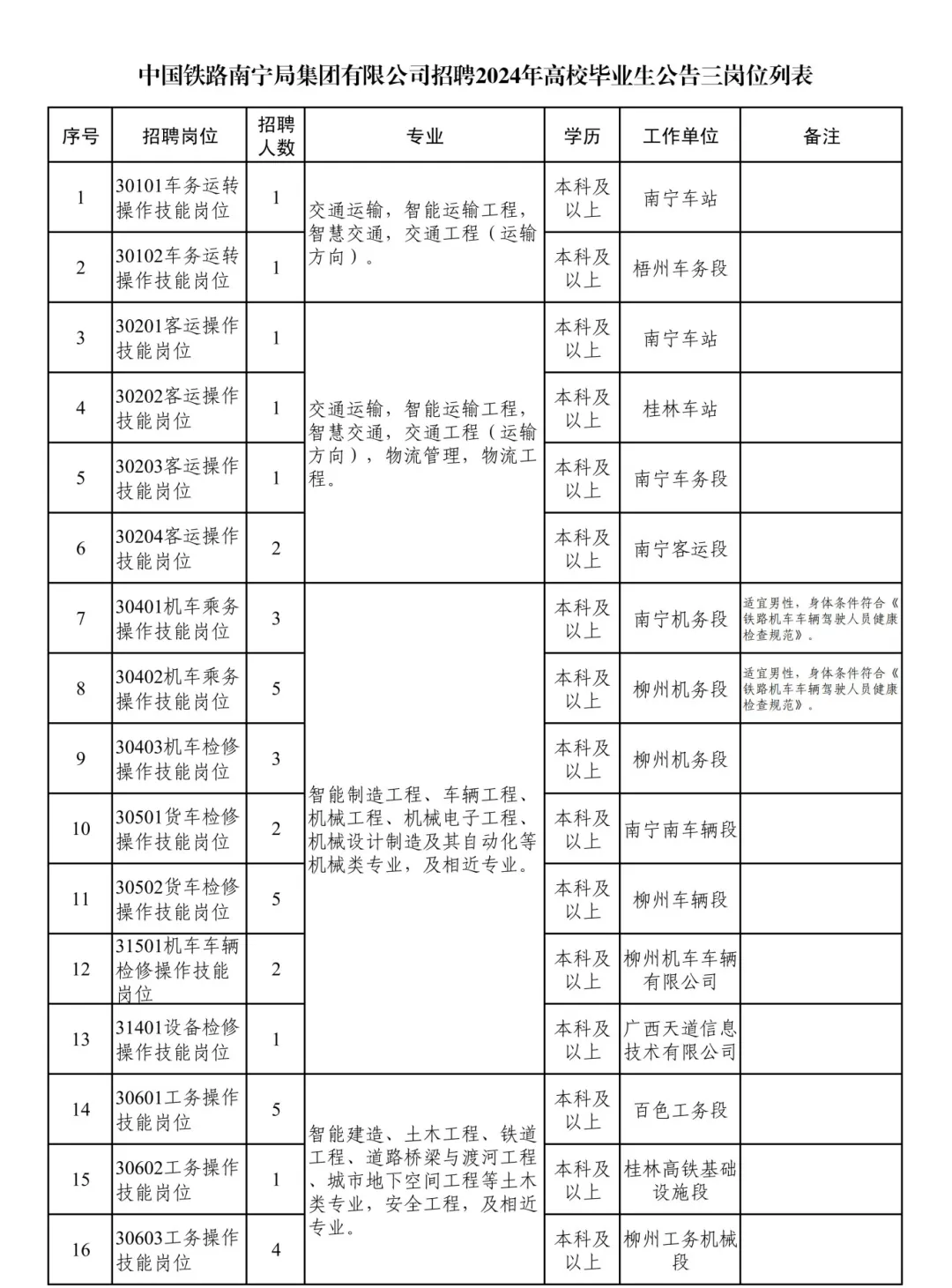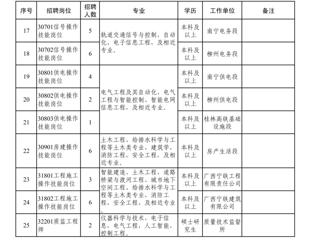 本次招聘岗位、专业、人数详见附件《中国铁路南宁局集团有限公司招聘2024年高校毕业生公告三岗位列表》。