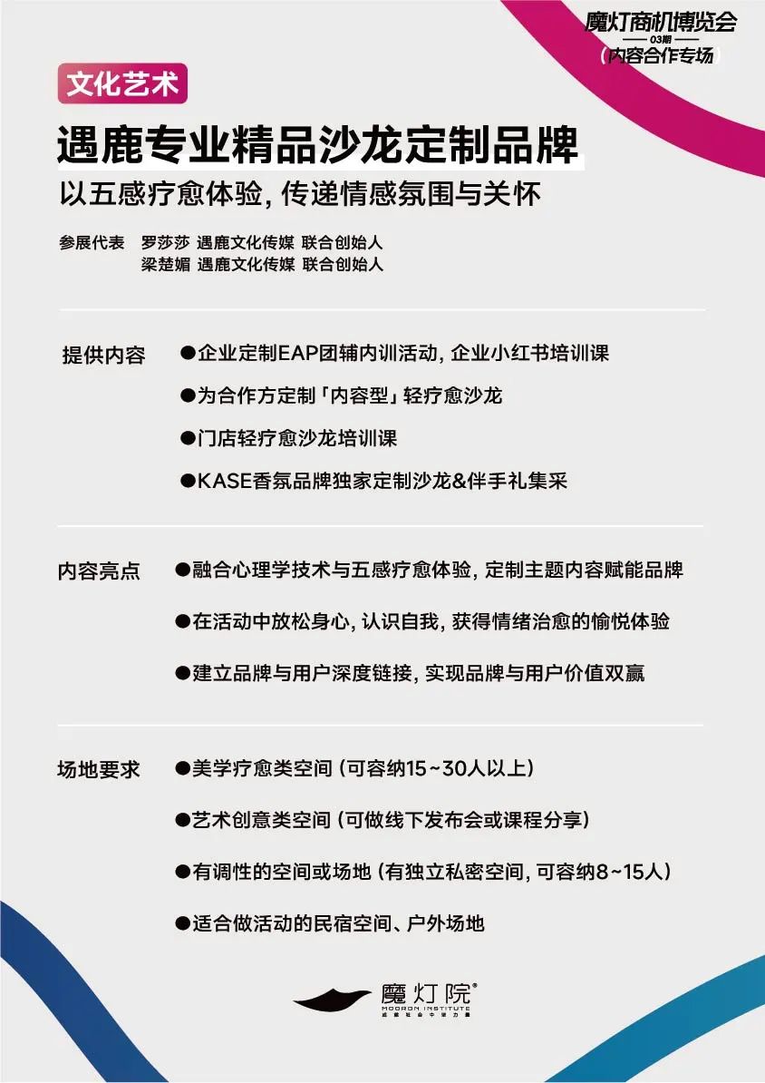 遇鹿秉持坚定的信念,沙龙内容设计首要的是活动体验本身,而活动体验本身是一个自我疗愈的独特感受,遇鹿围绕“活动感受”的设计理念,结合新时代下的情绪疗愈市场,融合五感疗愈“听觉、视觉、嗅觉、味觉、触觉”原创设计出符合品牌调性的活动内容,让参与者在各种不同类型的活动感知与体验中重新发现自我,建立品牌与用户的深度链接,赋能品牌深度。