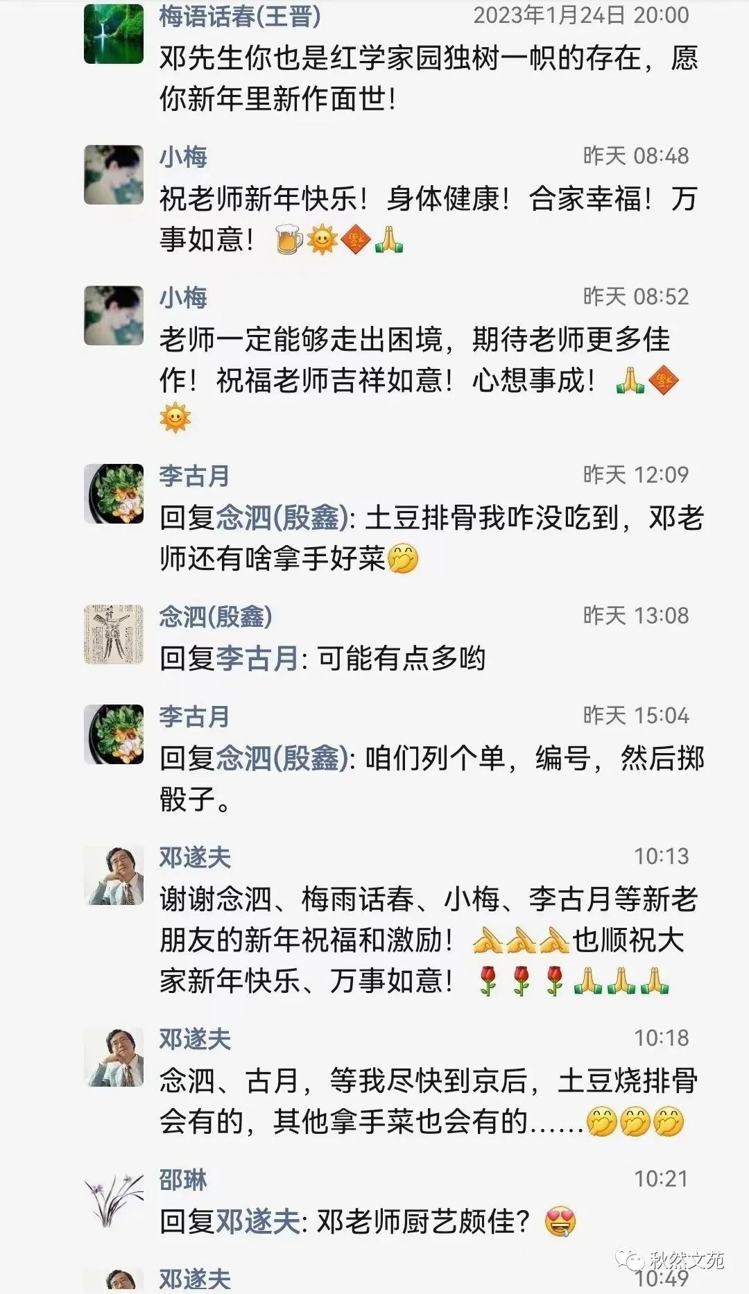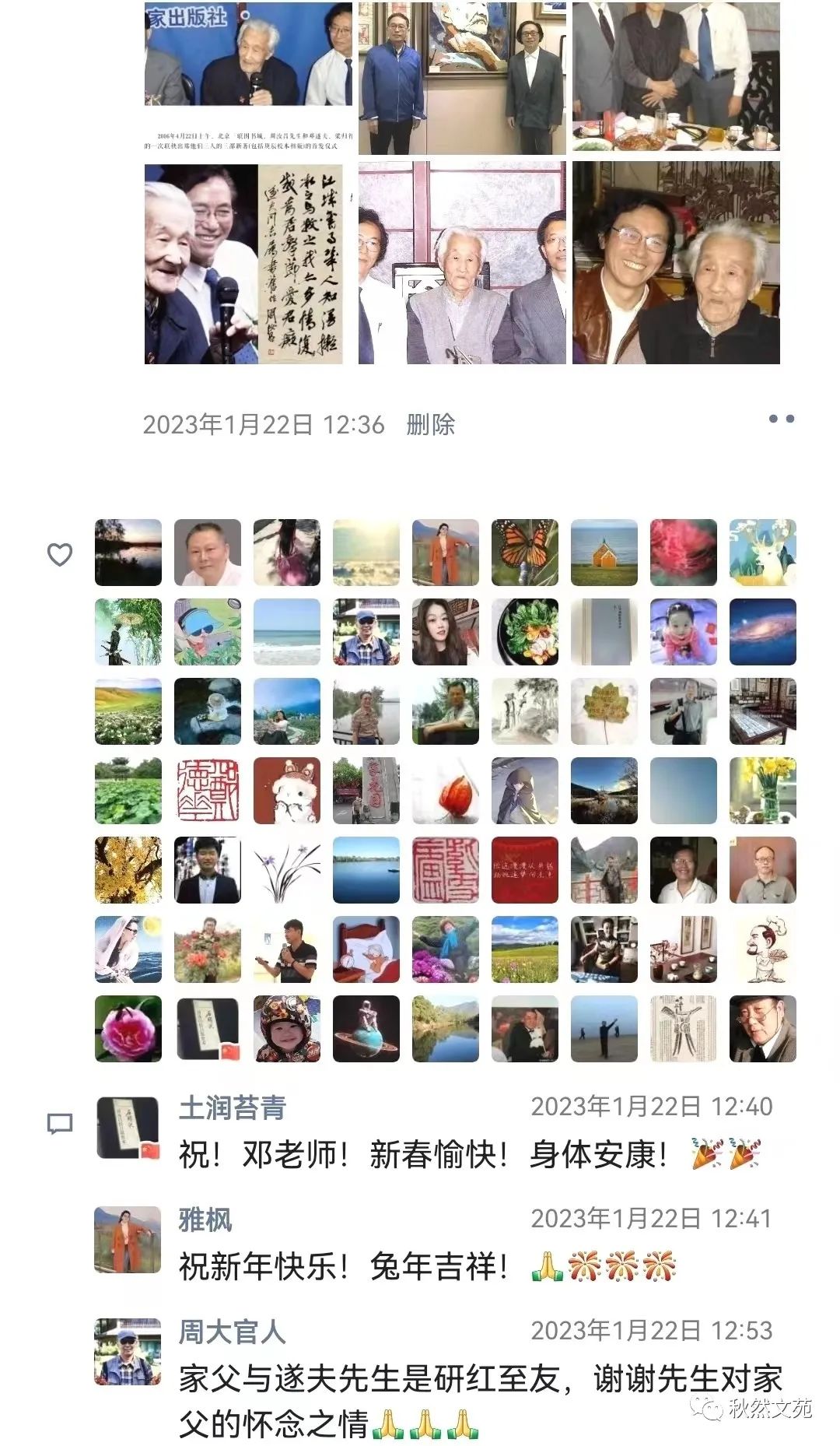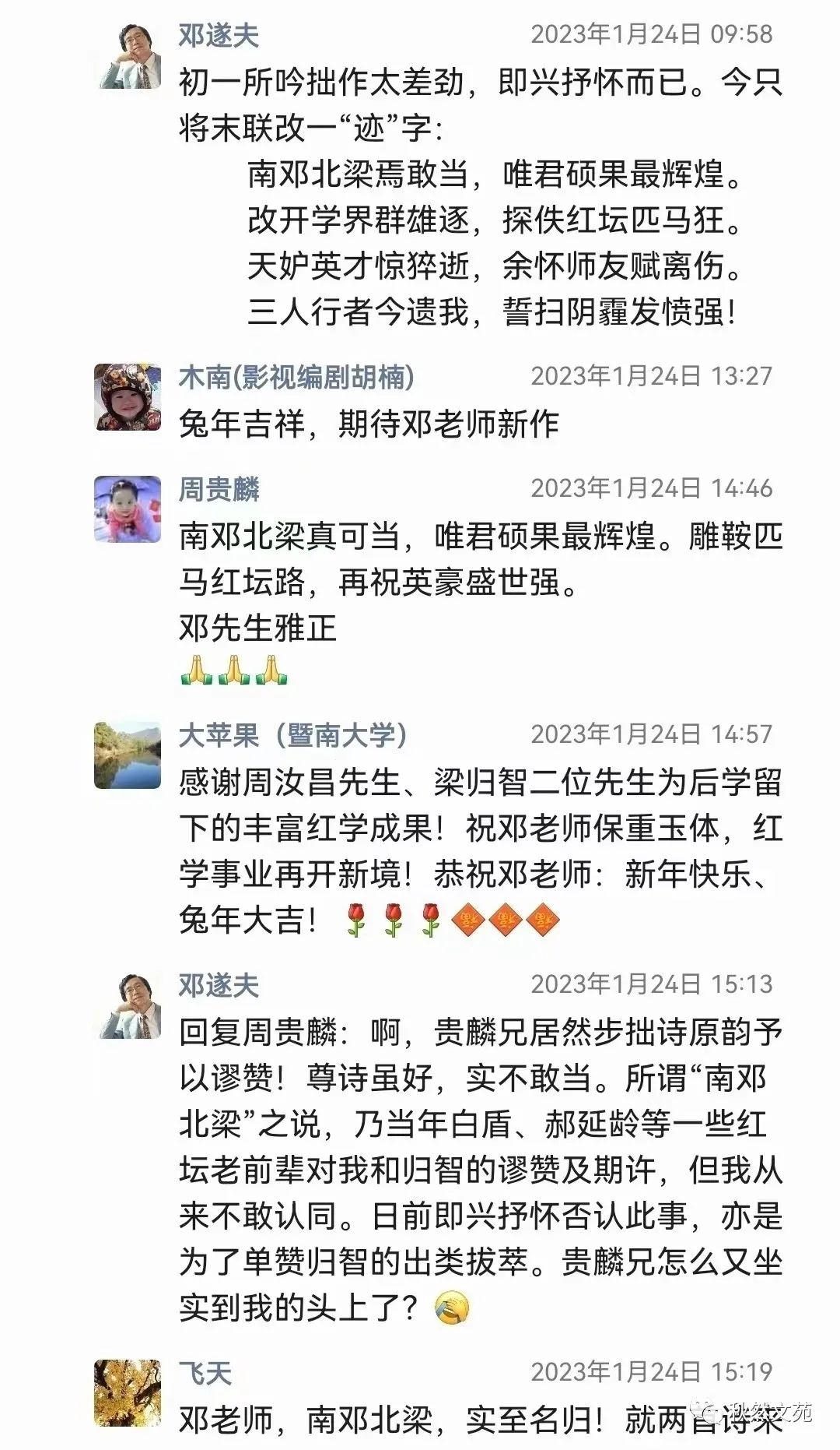 本篇开头,是在沿用《红楼梦》中“虎兔相逢大梦归”的谶语,以此贯穿寅虎岁尾、葵卯岁首这两个年份,来含蓄地表达在当前疫情和中美关系错综复杂情势下的某种感慨与忧虑。这足以说明邓遂夫先生在网络平台上零星发布的此类文字,确实具有重要和必要的鉴赏价值与收藏价值。微信朋友圈,正是他最常见的交流平台之一。我们经常可以从中感知到他貌似随心所欲,心随意动所抒发的诸多见解及人生观、世界观等。其内容的多样性,思想的鲜明性,谈吐的艺术性、哲理性等特色,都是值得随时加以关注,并作必要的原封不动收藏的。邓遂夫先生往往喜欢在凌晨或黎明时分,在朋友圈分享大量的社会热点信息,中外媒体国际时事报道,以及文化艺术、学术领域的最新动态等等。这些,都可能是他自己在广泛关注与阅读此类最新信息时,顺便分发给微信朋友们了解参考的。在分发的同时,他往往会直言不讳地发表一点他自己的观点看法,促使朋友们作认真的理解和思考。这在微信的流动性传播交流中,颇具积极的、正能量的引导推动作用。况且,我现在所整理转发的邓遂夫先生在兔年初一那天即兴赋诗,怀念师友所生发出来的这个朋友圈内容,是从2023年1月22日12点36分发出后,到25日10点21分截止。抛开大量潜水不露形迹的围观分享者不算,单是公开点赞关注的邓老师各方面朋友,即达整齐的七行之数——七九六十三位。此外,尚有27位红学界、文艺界人士或他的读者粉丝,公开在评论栏留下的数十条热情洋溢、生动话泼的评议或祝辞。像这样的朋友圈内容,对于秋然文苑订阅小号来说实属罕见。为此,本号征得邓遂夫先生同意,独家转载发表,向红迷或其他各界朋友们传递正能量文化信息。
