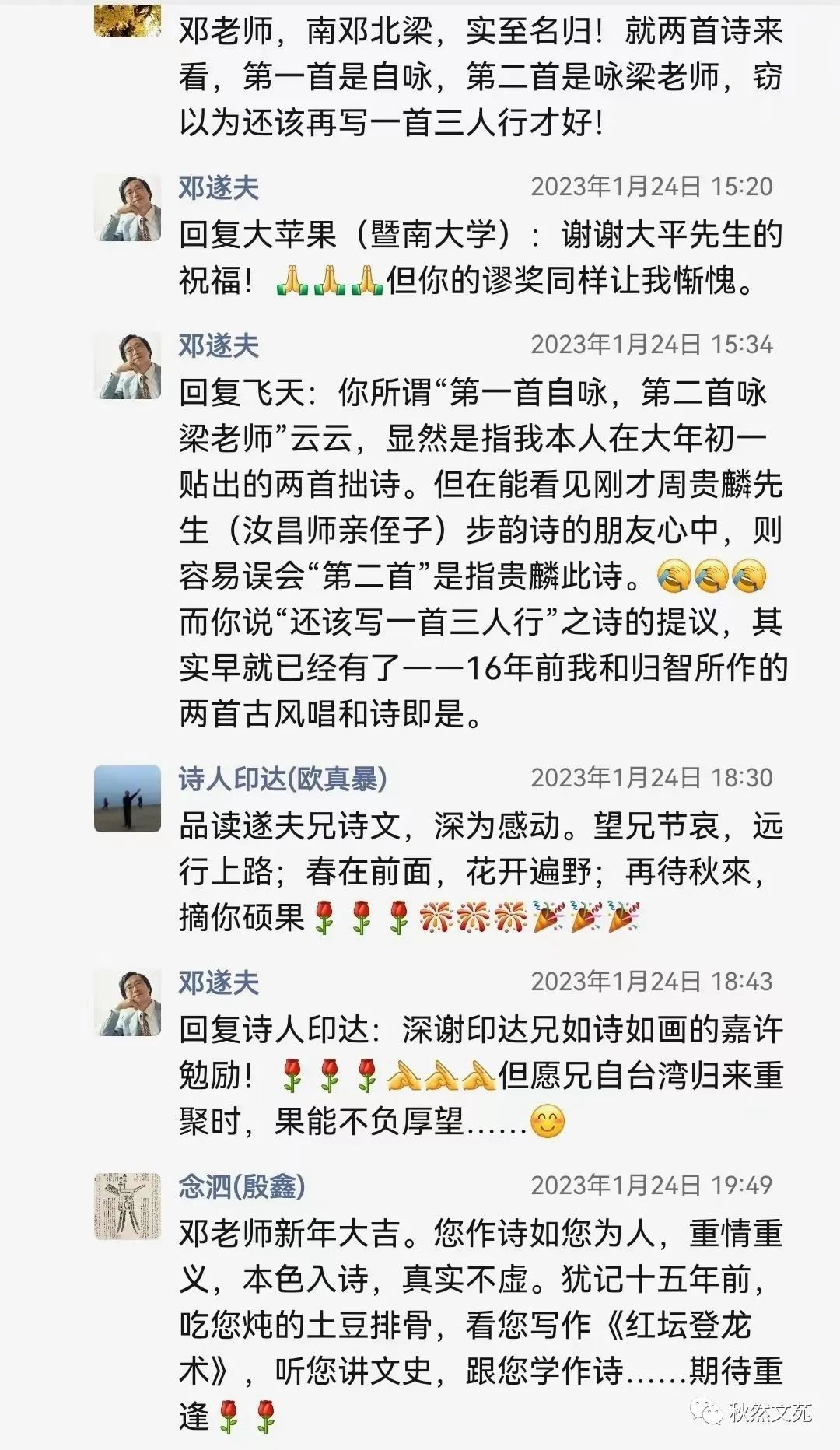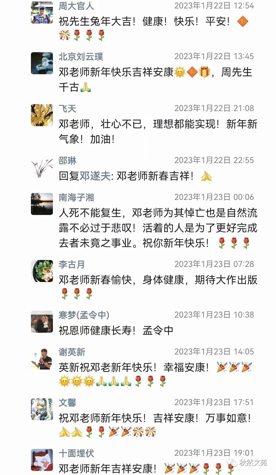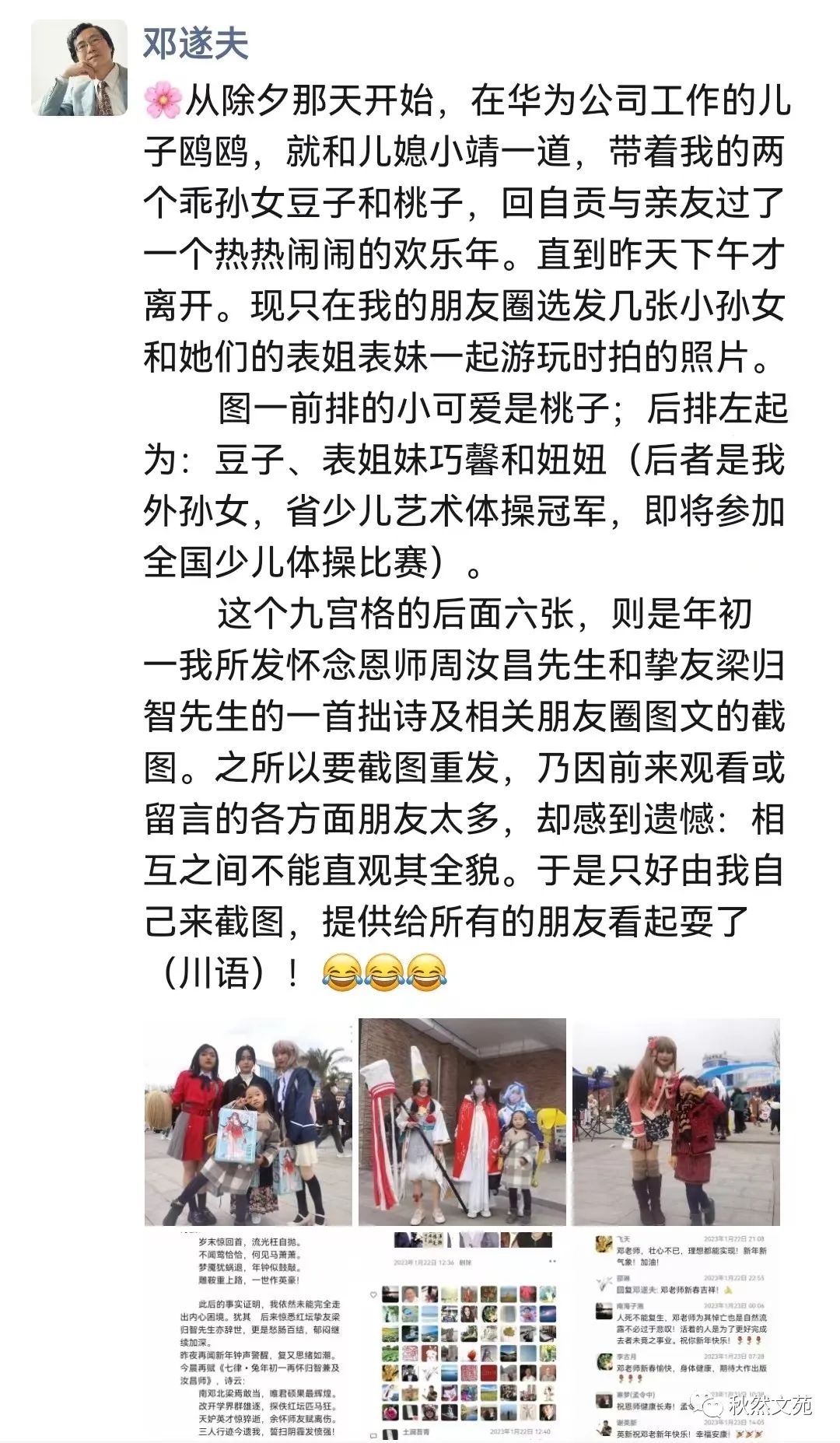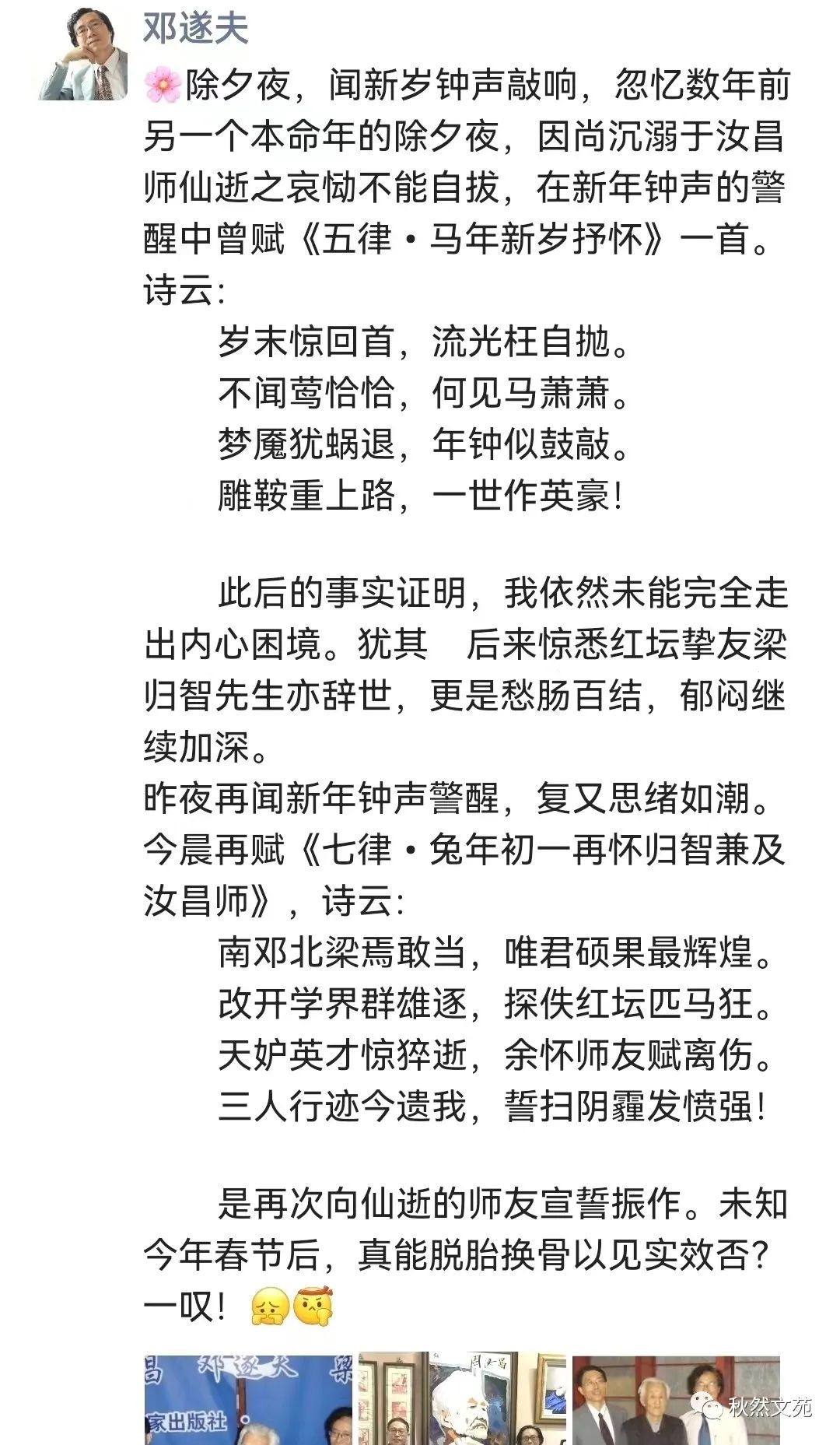 本篇开头,是在沿用《红楼梦》中“虎兔相逢大梦归”的谶语,以此贯穿寅虎岁尾、葵卯岁首这两个年份,来含蓄地表达在当前疫情和中美关系错综复杂情势下的某种感慨与忧虑。这足以说明邓遂夫先生在网络平台上零星发布的此类文字,确实具有重要和必要的鉴赏价值与收藏价值。微信朋友圈,正是他最常见的交流平台之一。我们经常可以从中感知到他貌似随心所欲,心随意动所抒发的诸多见解及人生观、世界观等。其内容的多样性,思想的鲜明性,谈吐的艺术性、哲理性等特色,都是值得随时加以关注,并作必要的原封不动收藏的。邓遂夫先生往往喜欢在凌晨或黎明时分,在朋友圈分享大量的社会热点信息,中外媒体国际时事报道,以及文化艺术、学术领域的最新动态等等。这些,都可能是他自己在广泛关注与阅读此类最新信息时,顺便分发给微信朋友们了解参考的。在分发的同时,他往往会直言不讳地发表一点他自己的观点看法,促使朋友们作认真的理解和思考。这在微信的流动性传播交流中,颇具积极的、正能量的引导推动作用。况且,我现在所整理转发的邓遂夫先生在兔年初一那天即兴赋诗,怀念师友所生发出来的这个朋友圈内容,是从2023年1月22日12点36分发出后,到25日10点21分截止。抛开大量潜水不露形迹的围观分享者不算,单是公开点赞关注的邓老师各方面朋友,即达整齐的七行之数——七九六十三位。此外,尚有27位红学界、文艺界人士或他的读者粉丝,公开在评论栏留下的数十条热情洋溢、生动话泼的评议或祝辞。像这样的朋友圈内容,对于秋然文苑订阅小号来说实属罕见。为此,本号征得邓遂夫先生同意,独家转载发表,向红迷或其他各界朋友们传递正能量文化信息。