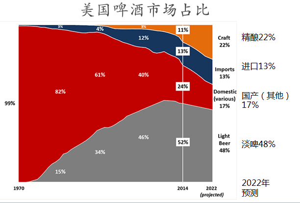总的来说,啤酒的总产量是保持一个比较稳定的状态,但是美国精酿啤酒2013年增长率是17.2%,2014年增长率是17.6%,2015年12.8%。美国整个啤酒市场量是维持在一千亿美元左右,但是精酿啤酒的一个总市场量,从2013年的143亿美元,增加到2014年的196亿美元,最后增加到2015年的223亿美元,这个增长幅度是非常巨大的。之前外国专家曾分享过对美国精酿啤酒的不同种类的份额预测图,即从2014年到2022年精酿啤酒从现在的11%增加到22%,这个数字非常惊人。我们知道美国有几千家啤酒厂,品牌也是非常多,可以说是百花齐放。