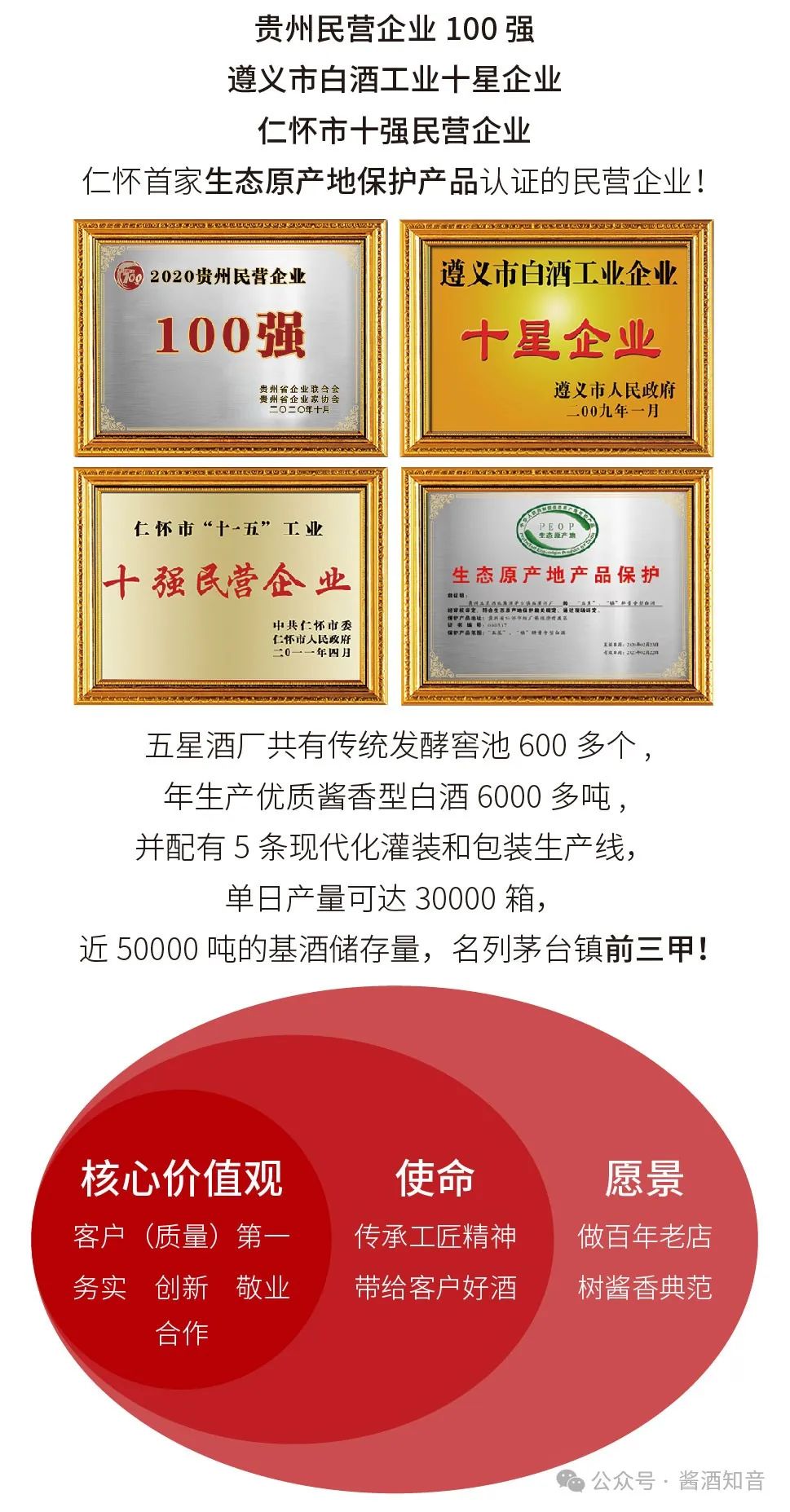 贵州五星酒业集团有限公司成立于1993年,是“贵州民营企业100强”、“遵义市白酒工业十星企业”、“仁怀市十强民营企业”、“仁怀首家生态原产地保护产品认证”的民营企业!五星酒厂共有传统发酵窖池600多个,年生产优质酱香型白酒6000多吨,并配有5条现代化灌装和包装生产线,单日产量可达30000箱,近50000吨的基酒储存量,名列茅台镇前三甲!