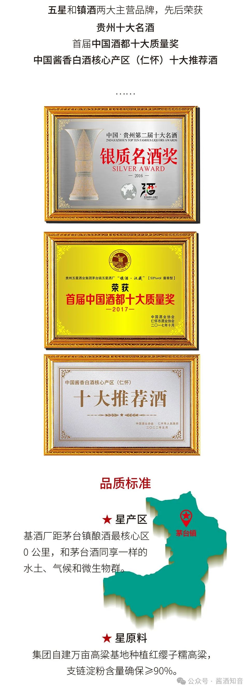 贵州五星集团旗下现有三大主营品牌“五星”、“镇酒”和“国沙”,先后荣获“贵州十大名酒”,“首届中国酒都十大质量奖”、“中国酱香白酒核心产区(仁怀)十大推荐酒”等荣誉。