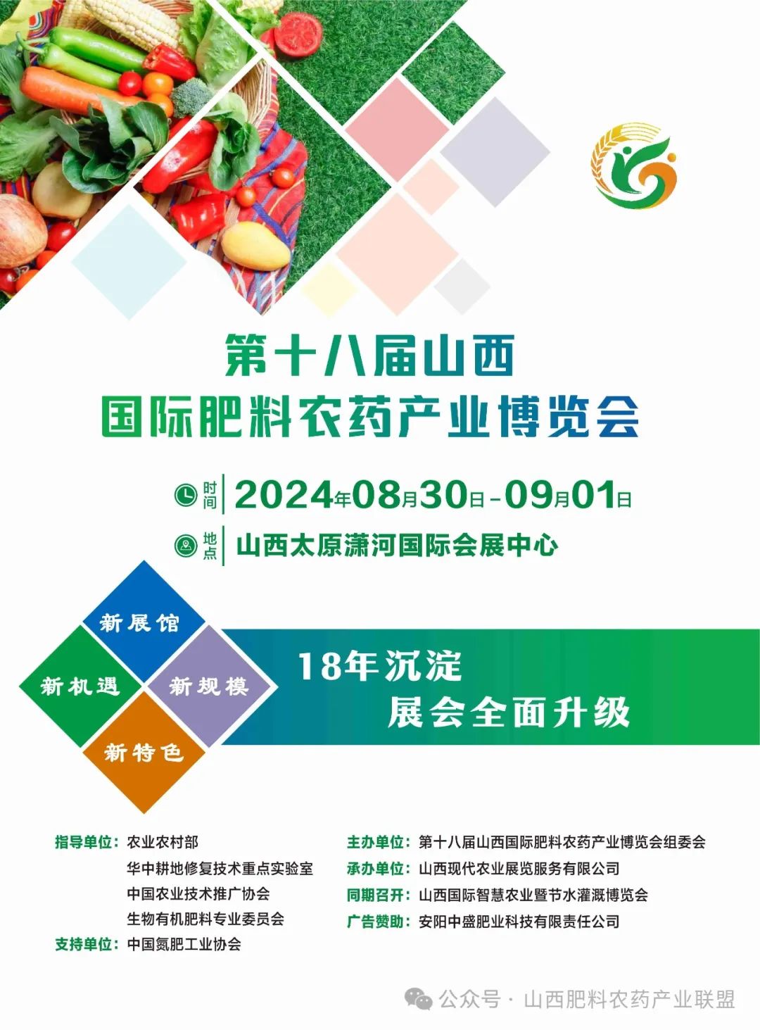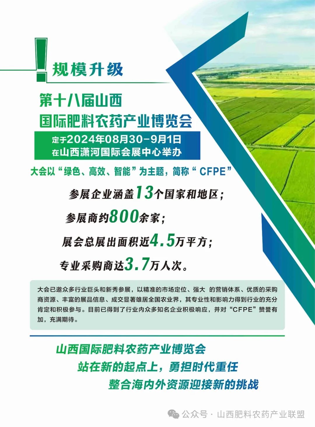 “2024第十八届山西国际肥料农药产业博览会”,定于2024年08月30-9月1日在山西潇河国际会展中心举办。大会以“绿色、高效、智能”为主题,以下简称“ CFPE”。