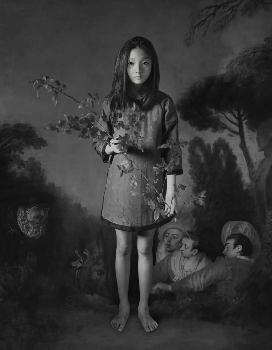 以冯君蓝的几件创作为例。《明日何如》源于生态不断恶化的背景下,对于下一代生存处境的忧虑和呼唤,小男孩站在浪涛汹涌间,他身上的银杏叶衣服是艺术家在上海捡拾、带去台北制作的;《不知身处》的背景来自19世纪的一幅油画作品,画面中一位西方男子被替换为东方女性的形象,艺术家借这种“错置”传达当代人时常面对的陌生疏离,甚至孤绝失重的状态;《道在万物》中每一件“物”都以平等的方式被注目,如果说道内蕴在万物之中,那么观想所造之物也是认识道的途径。