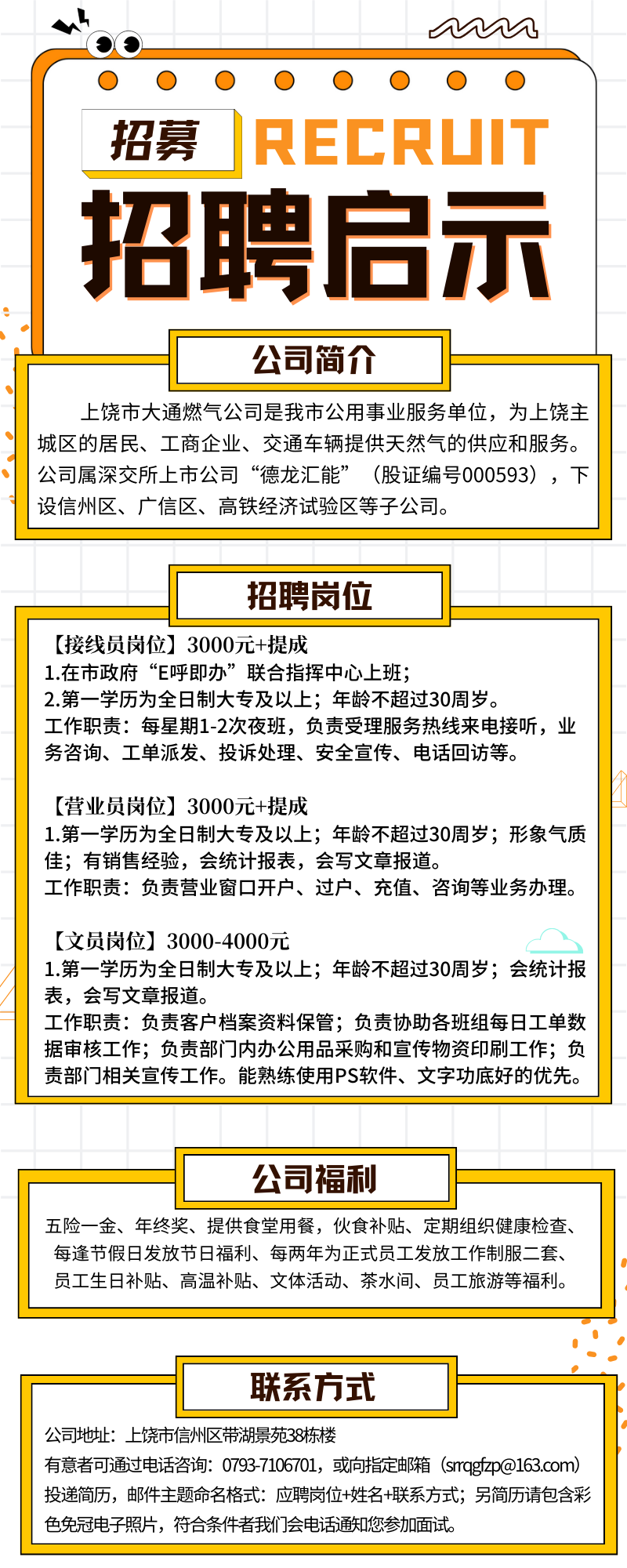 【上饶招聘】上饶市信州区大通燃气公司招聘公告