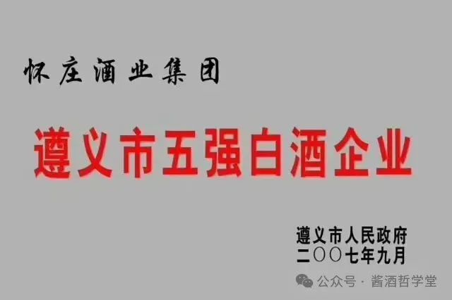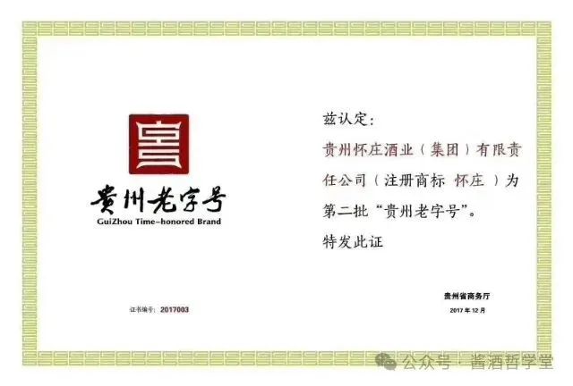 2015年6月5日获国家工商总局认定为“中国驰名商标”,2015年9月9日荣获:2015比利时布鲁塞尔国际烈性酒大赛金奖;2017年获评“贵州老字号”品牌称号。建厂以来,怀庄人坚持“诚信酿造未来·和谐发展怀庄”的理念。
