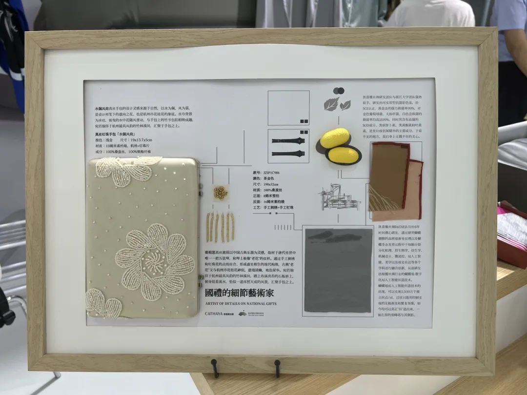 此外,展出的国宾夫人礼系列产品同样令人瞩目。以“柳浪闻莺”真丝手包为例,其正面采用了手工刺绣与手工钉珠的传统工艺,背面则应用数字化AI人工智能织造技术,实现每平方米5500万个独立织点,将过往只能用印刷实现的繁复图案可以真正“织造出来”。