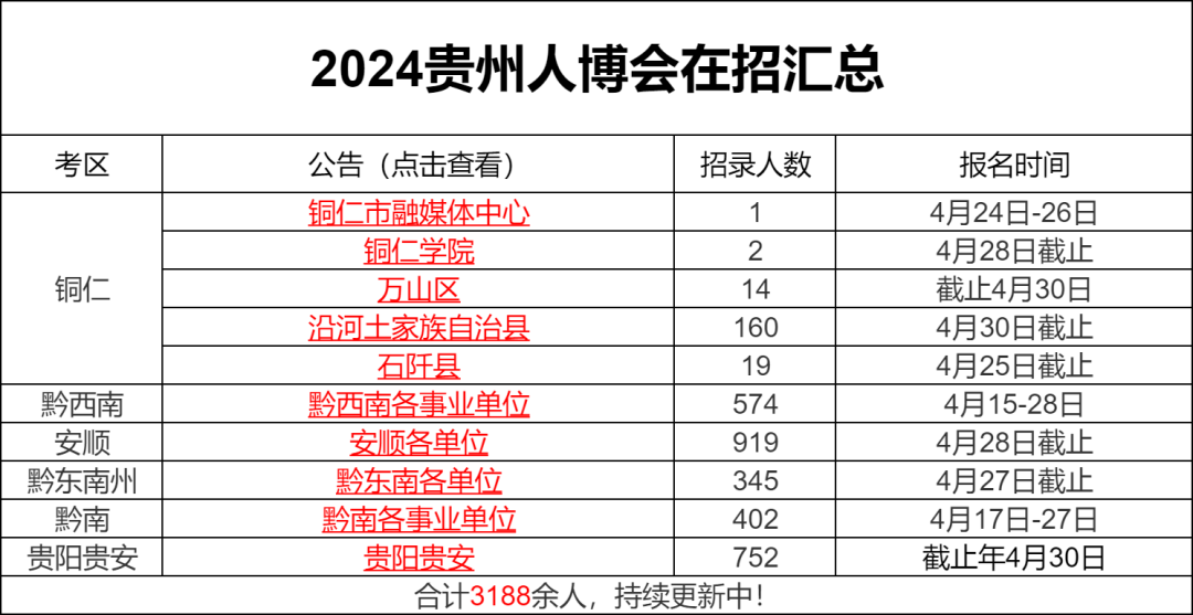 贵州第十二届人才博览会正在招聘中,其中部分单位已经招聘结束,目前还有多家单位还在招聘,在招岗位招聘人数有3188人。