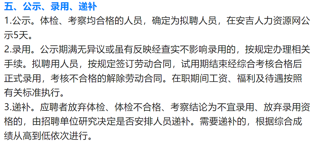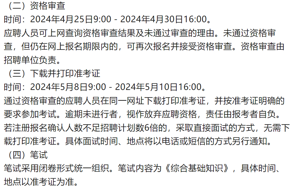 按照发布公告→注册报名→资格审查→下载打印准考证→笔试→面试→体检及考察→公示及聘用的程序进行。