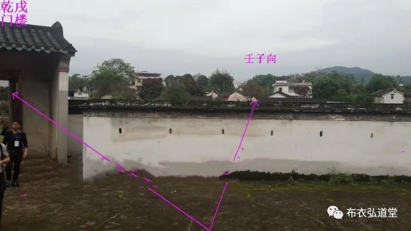 在正屋前面出口方左边乾位317度开大门楼,门立巽山乾向兼辰戌。以乾戌门楼为主枢钮,来收山纳水之用。以右边围墙作法收正屋朝向之壬子来水、以左边围墙作法收聚酉庚水出口为三水合一之大用。屋前小圳水右水倒左,经门楼和大门明堂之前而过,以两门为纳局。屋后的大河水右水倒左,流过主屋后面的花台与前门的流水三合一局。足见前门楼与后花台乃是阳宅最重要的补救之大法。