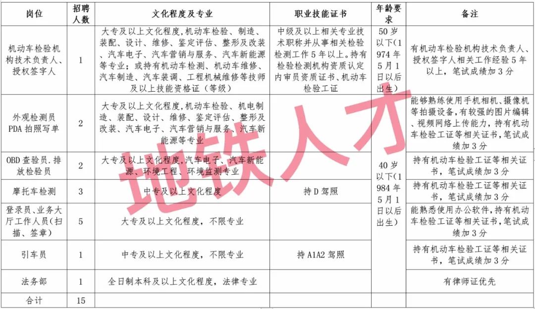 此次招聘岗位7个,招聘计划15名,详见附件1:《桑植县交投机动车检测有限责任公司招聘岗位表》。