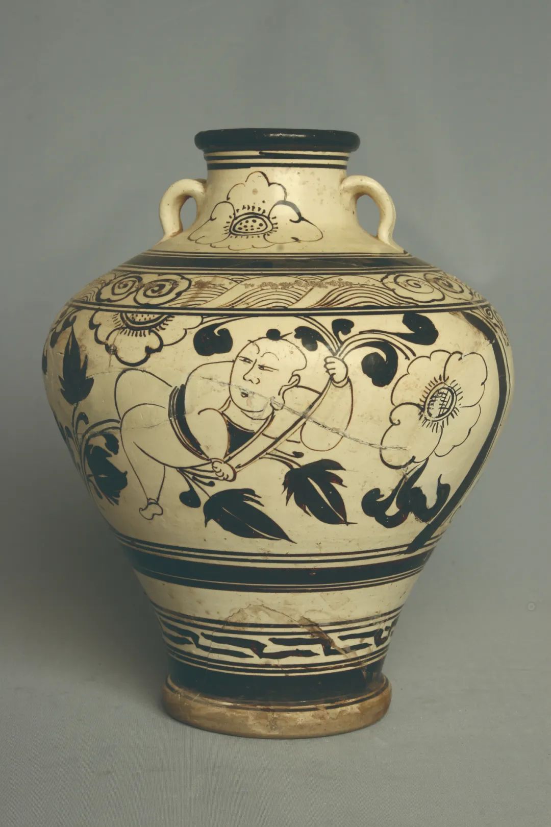明代白地黑花婴喜纹罐