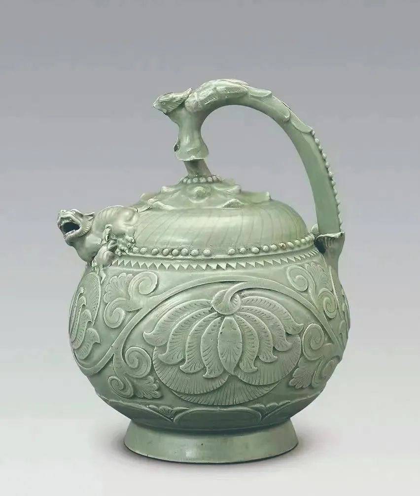 20世纪70年代在陕西彬县出土的五代青釉刻花牡丹纹提梁倒注壶,极为罕见。它是耀州窑青瓷造型与装饰和实用功能完美结合的范例,不但造型别致、结构奇特、装饰精美华丽,还是一件实用的酒器。与一般瓷壶不同的是,其壶身顶部无注水口,以模塑的柿蒂为假盖;提梁塑以卧伏的凤凰,凤首高翘、突目作欲飞状,弯曲的凤身满饰联珠纹;壶流塑一哺乳的母狮,侧身伏卧,四肢趴地,侧颈抬首,盆口大张,利齿外露成壶流;其下的幼狮肢登母狮肚皮,作吮乳状。圆鼓的弧腹剔刻大朵缠枝牡丹,其中三朵盛开的团花突凸,具有强烈的装饰效果;壶身满施青釉,晶莹透亮,纹饰在釉下清晰可见、相得益彰。更为神奇和充满玄机的是,注水口不在上部却在壶底,壶底设一梅花小孔,注水时要将壶身翻颠,注满后再将壶身置正,水却不会从底部露出。聪明的窑工早在一千多年前就掌握了“液面等高”原理,将其运用得完美、天衣无缝。