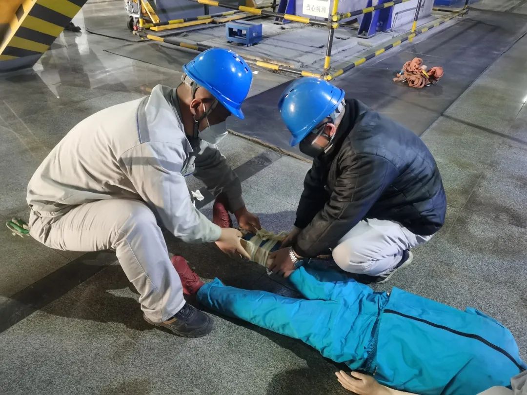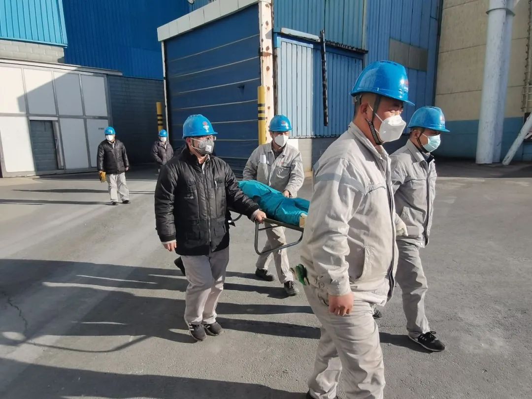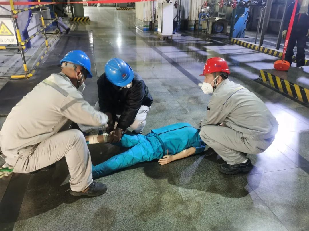 演练场景为1号炉捞渣机刮板更换工作时,突然发生卷扬机钢丝绳断开,将一名检修人员小腿腿部打骨折。演练中,各救援小组分工明确,环节衔接顺畅,协调组织有序,物资到位及时,汇报准确清晰,伤员救治专业,实现了事故抢险救援信息的双向快速交流沟通,较好完成本次机械伤害应急演练。