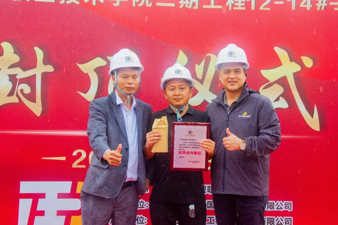封顶仪式上,东正建设集团董事长,对项目施工过程中做出突出贡献的作业班组及项目施工主管,分别颁发了荣誉证书、奖杯及奖金。